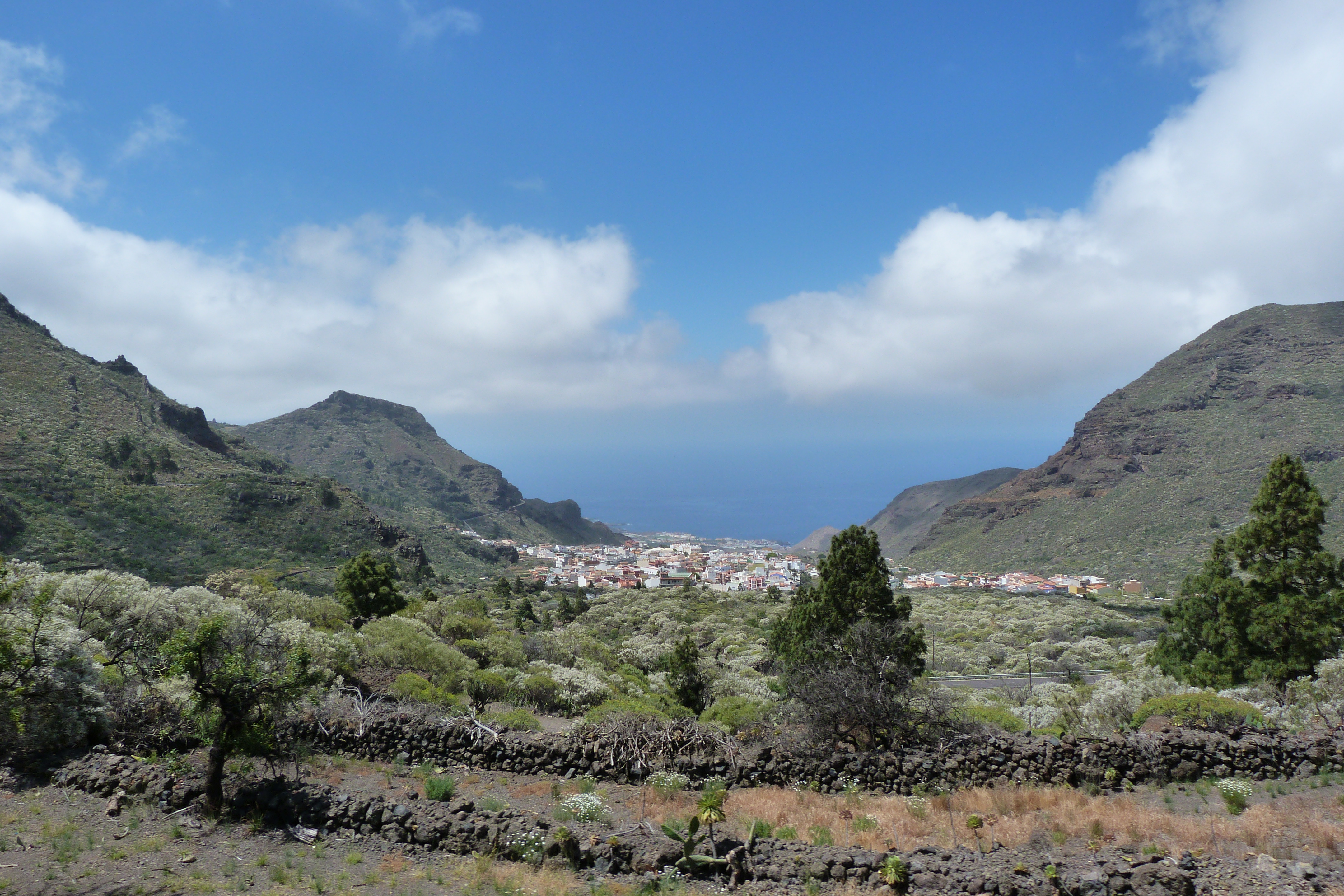 Paisaje de Tenerife. Horizonte del océano entre montañas. Vegetación de Fayal-brezal: Se trata de un bosque, pero en este caso más seco y pobre en especies. Destacan florísticamente las fayas, brezos, acebiños,... También abundan diferentes especies de setas que pueden ser tanto comestibles como muy venenosas.
