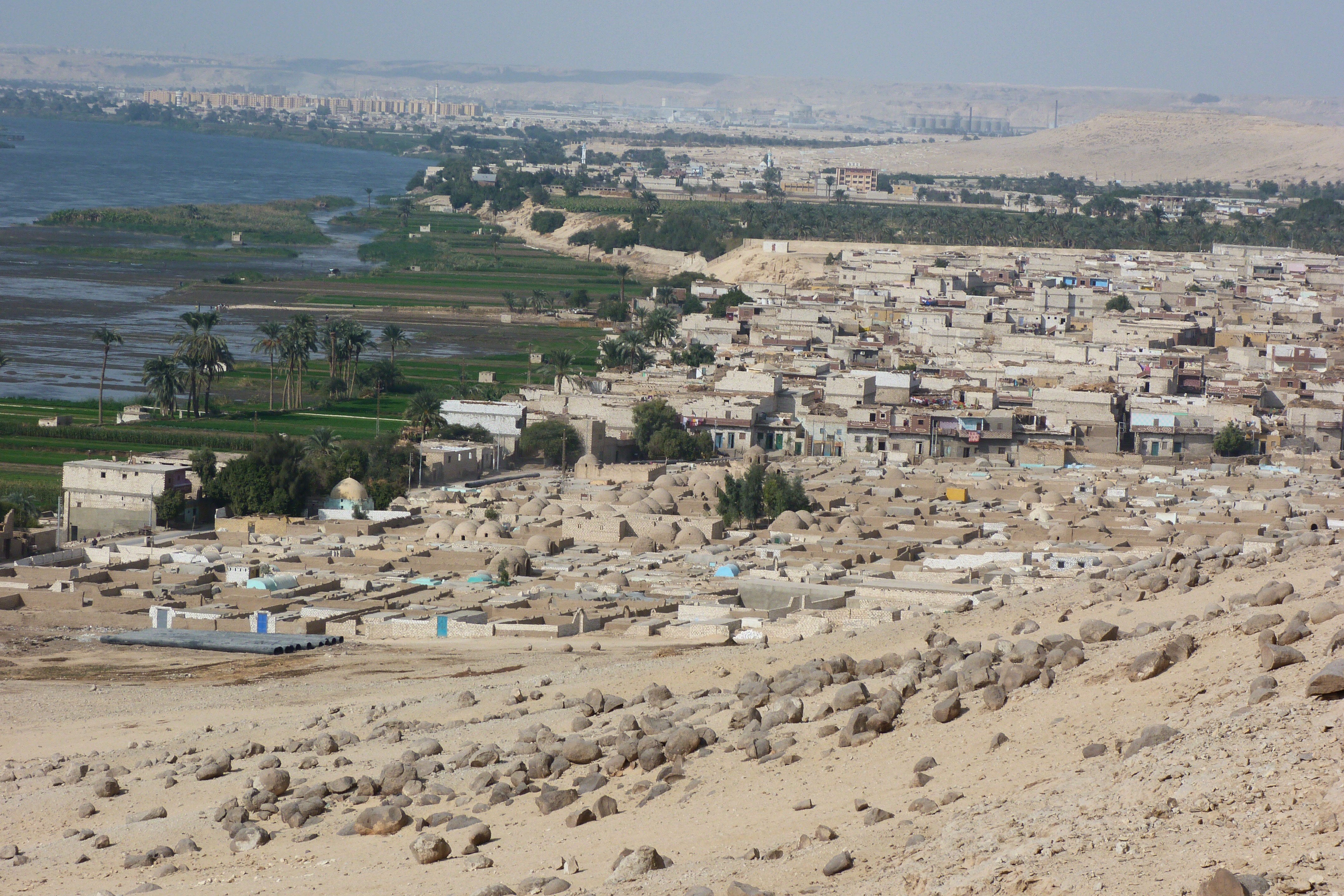 Casas de agricultores a la orilla del Nilo y sus cultivos.