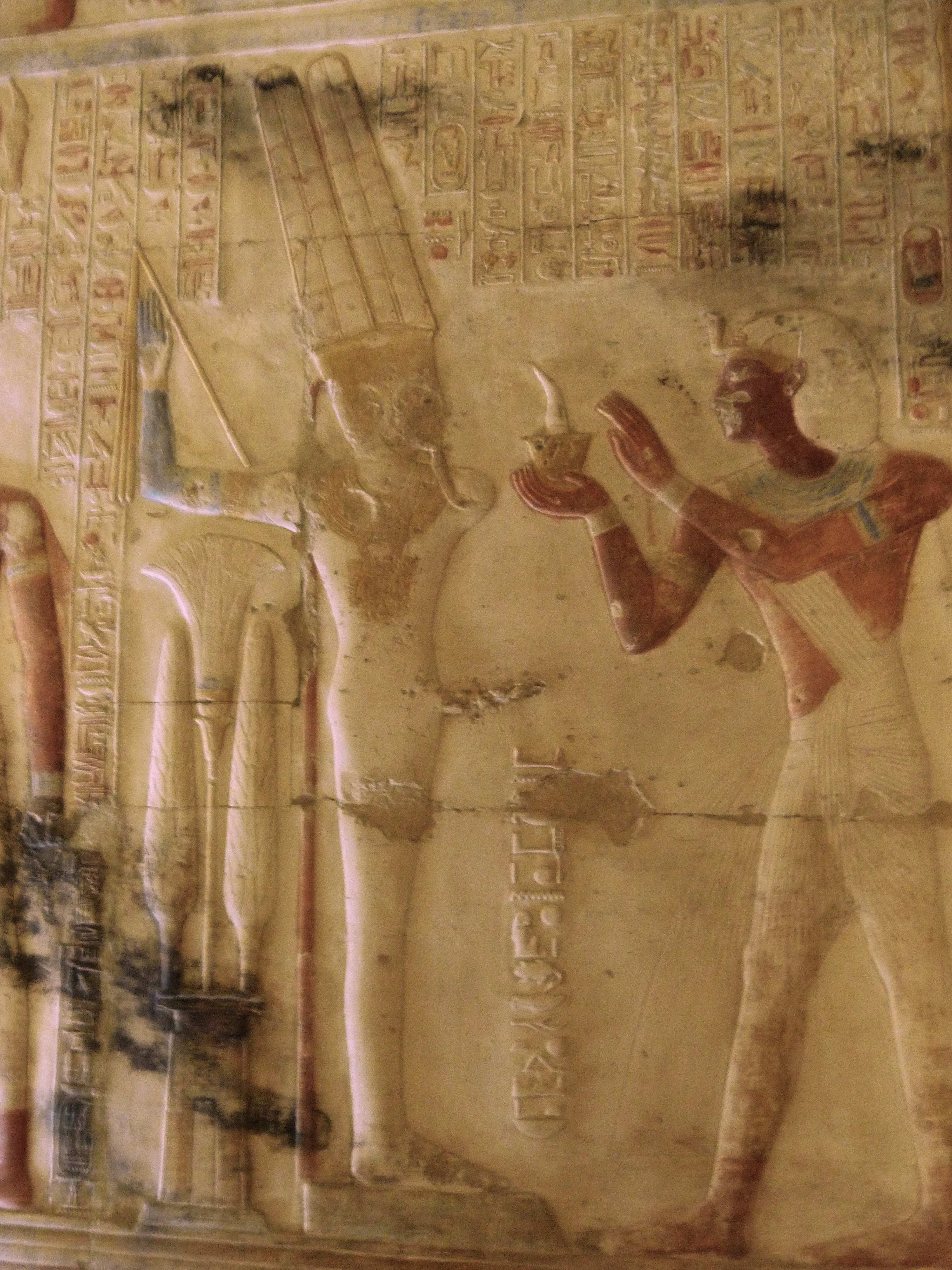 relieves con restos de color en el interior del templo de Setis I en Abydos. Dioses Min y Amón