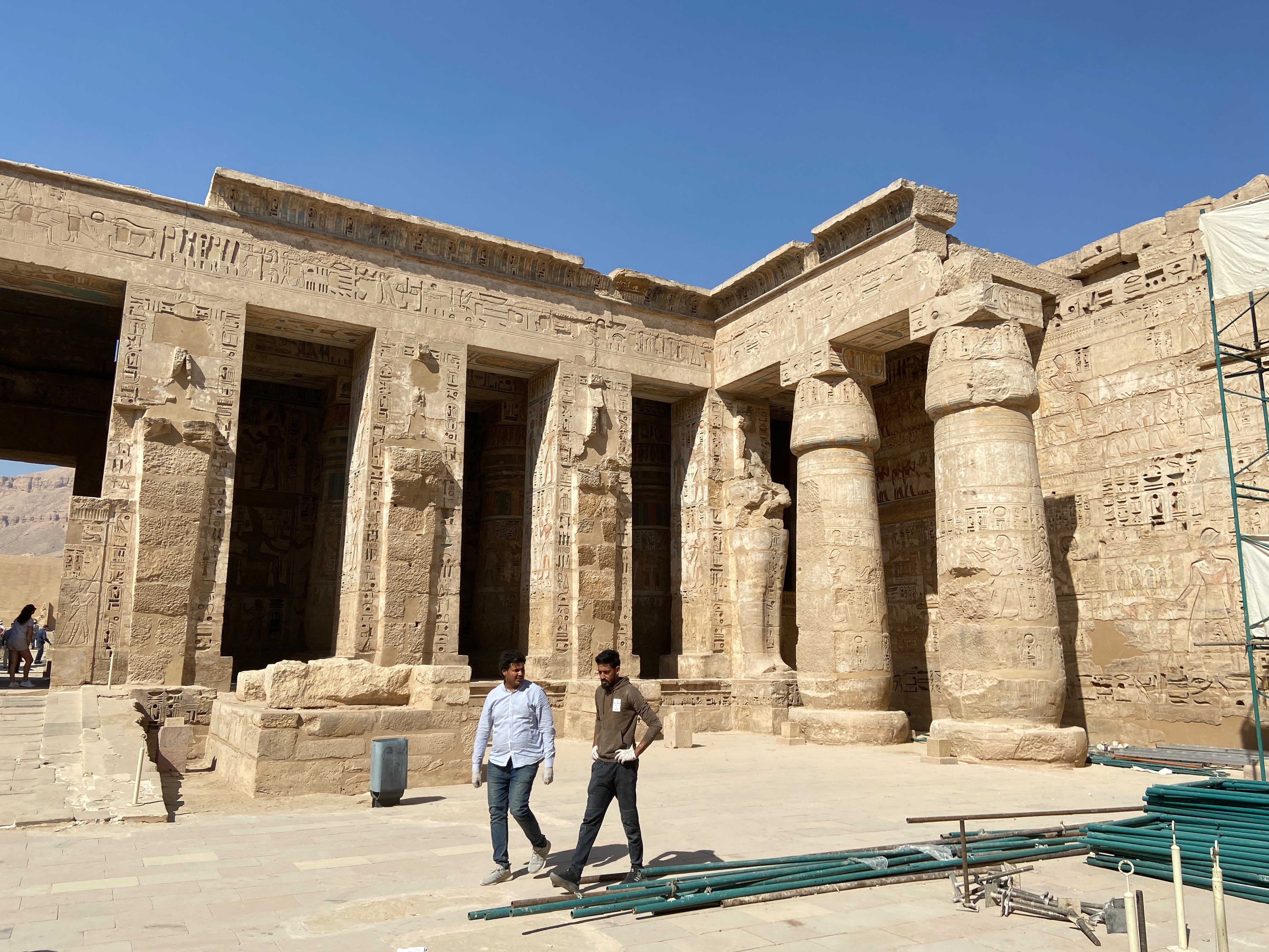 Columnas papiriformes y esculturas del primer patio del templo funerario de Ramsés III en Medinet Habu