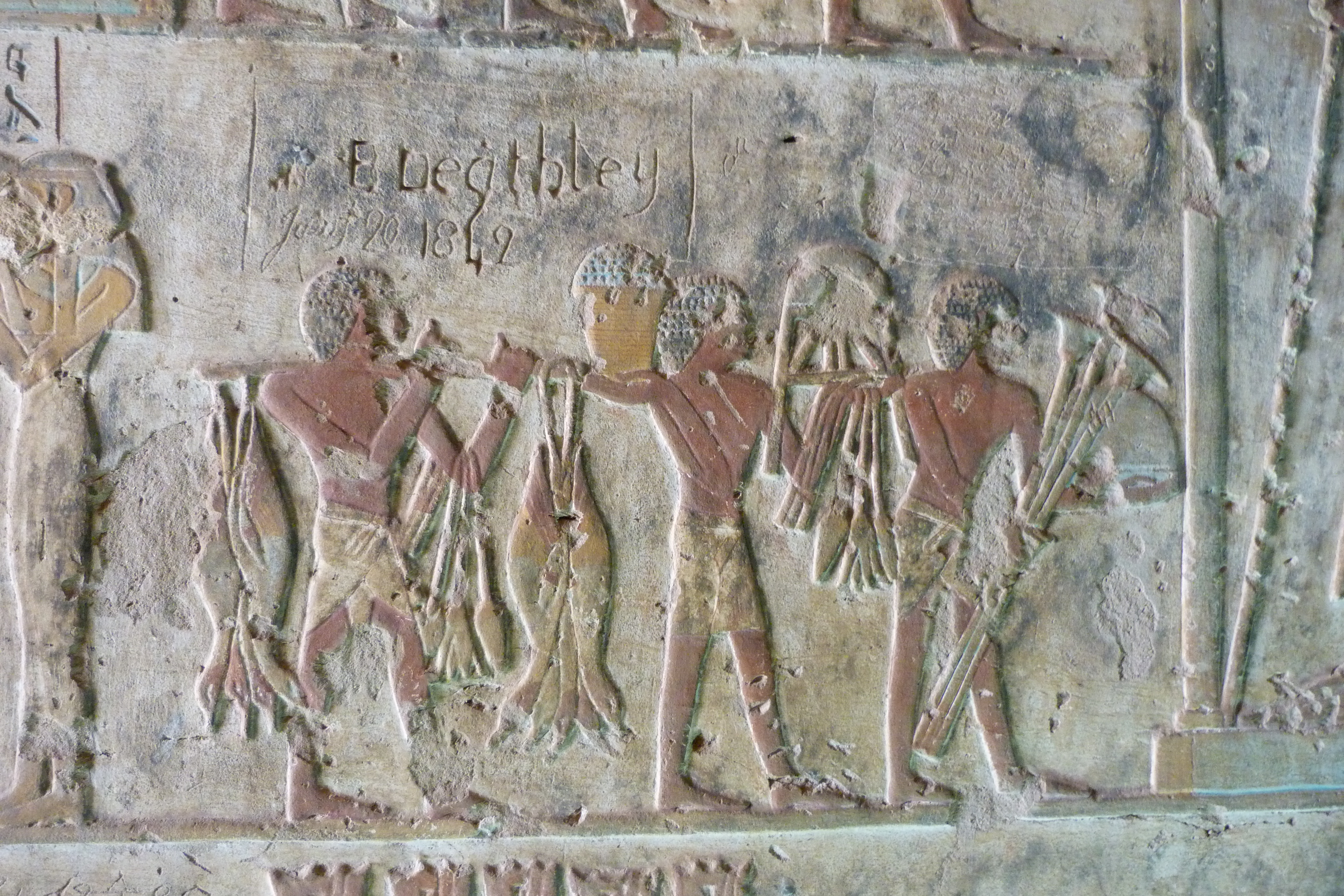 Relieve de cazadores en la tumbas de Kab en Egipto. Estas tumbas son muy diferente de las que vemos en Luxor, pertenecen a antiguos sacerdotes/gobernantes de la ciudad por lo que las escenas y los jeroglíficos son diferentes, hay escenas de la vida cotidiana, como la cosecha, el trabajo de la tierra.