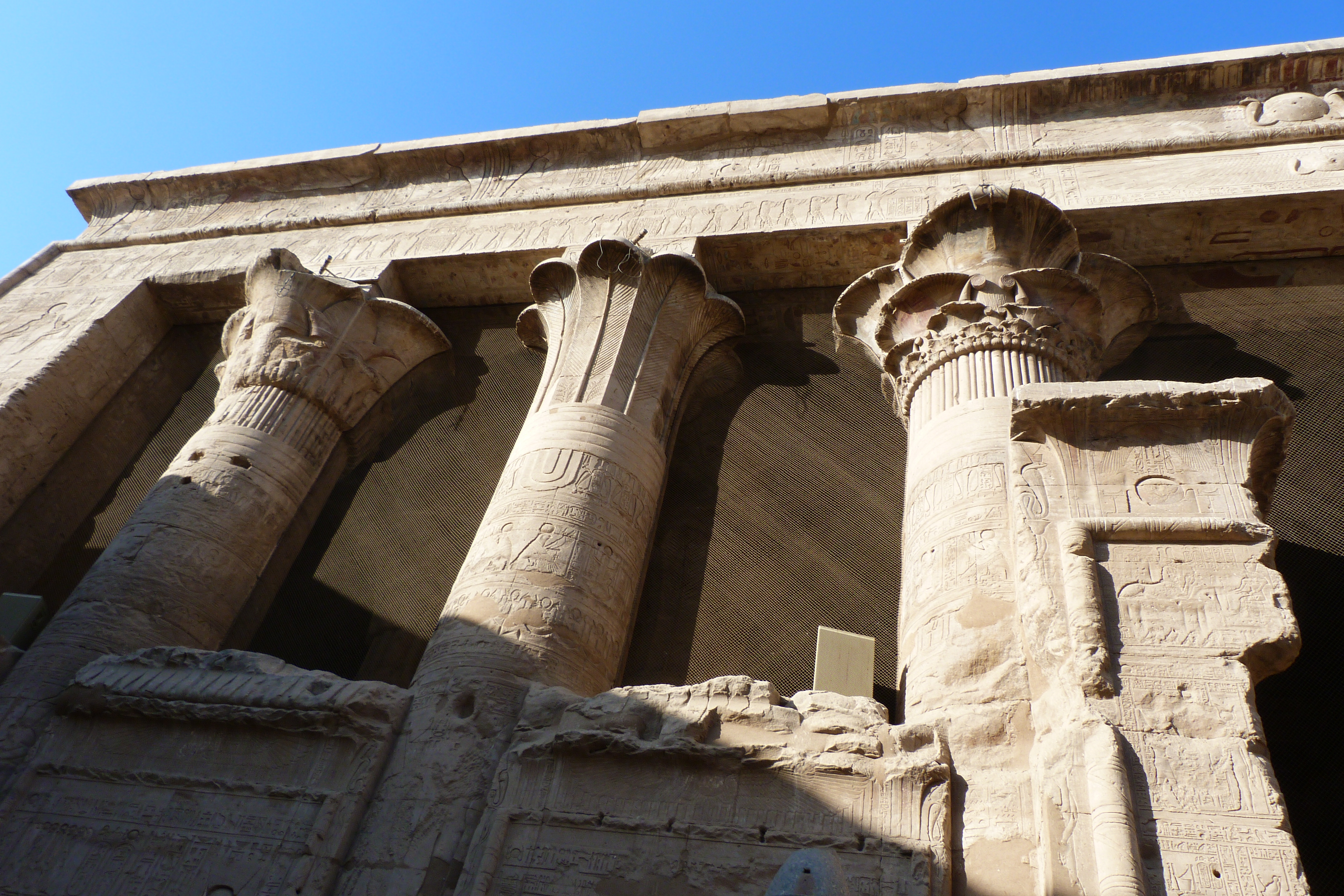 Capiteles de las columnas de la sala hipóstila del templo de Horus en Edfu. El Templo de Edfu es un templo de Antiguo Egipto ubicado en la ribera occidental del Nilo en la ciudad de Edfu que durante el periodo grecorromano fue conocida como Apolinópolis Magna, dedicada al dios de los dioses, Horus-Apolo.​ Es el segundo templo más grande de Egipto después de Karnak y uno de los mejor conservados. El templo, dedicado al dios halcón Horus, fue construido durante el periodo helenístico entre 237 y 57 a. C. Las inscripciones en sus paredes proporcionan información importante sobre el lenguaje, la mitología y la religión durante el mundo grecorromano en Antiguo Egipto. En particular, sus textos inscritos sobre la construcción del templo "proveen detalles de su construcción y también conservan información sobre la interpretación mítica de este y otros templos como la Isla de la Creación".​ También existen "escenarios e inscripciones importantes del Drama Sagrado que relacionaron el conflicto antiquísimo entre Horus y Seth".​