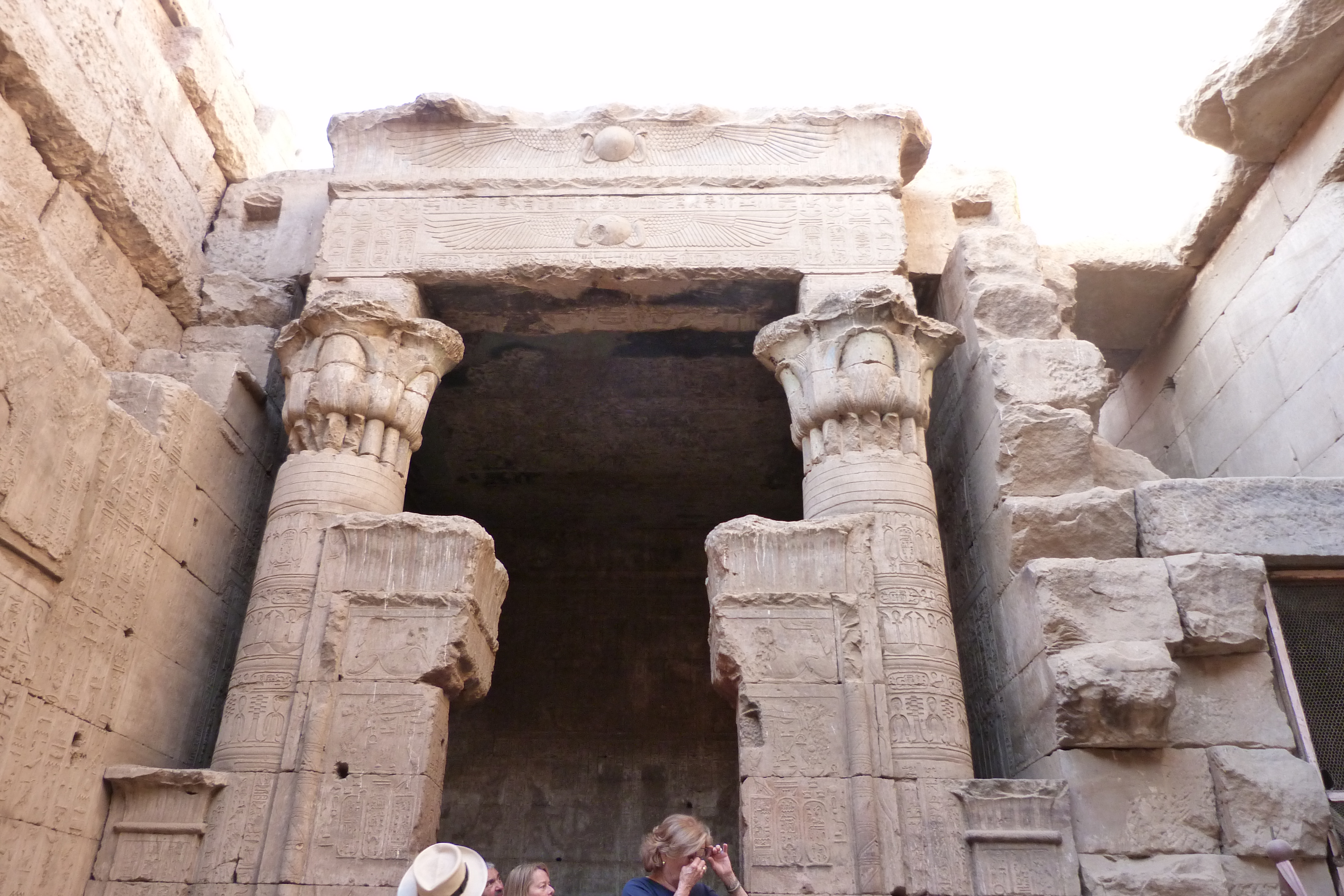 Capilla lateral del templo de Horus en Edfu. El Templo de Edfu es un templo de Antiguo Egipto ubicado en la ribera occidental del Nilo en la ciudad de Edfu que durante el periodo grecorromano fue conocida como Apolinópolis Magna, dedicada al dios de los dioses, Horus-Apolo.​ Es el segundo templo más grande de Egipto después de Karnak y uno de los mejor conservados. El templo, dedicado al dios halcón Horus, fue construido durante el periodo helenístico entre 237 y 57 a. C. Las inscripciones en sus paredes proporcionan información importante sobre el lenguaje, la mitología y la religión durante el mundo grecorromano en Antiguo Egipto. En particular, sus textos inscritos sobre la construcción del templo "proveen detalles de su construcción y también conservan información sobre la interpretación mítica de este y otros templos como la Isla de la Creación".​ También existen "escenarios e inscripciones importantes del Drama Sagrado que relacionaron el conflicto antiquísimo entre Horus y Seth".​