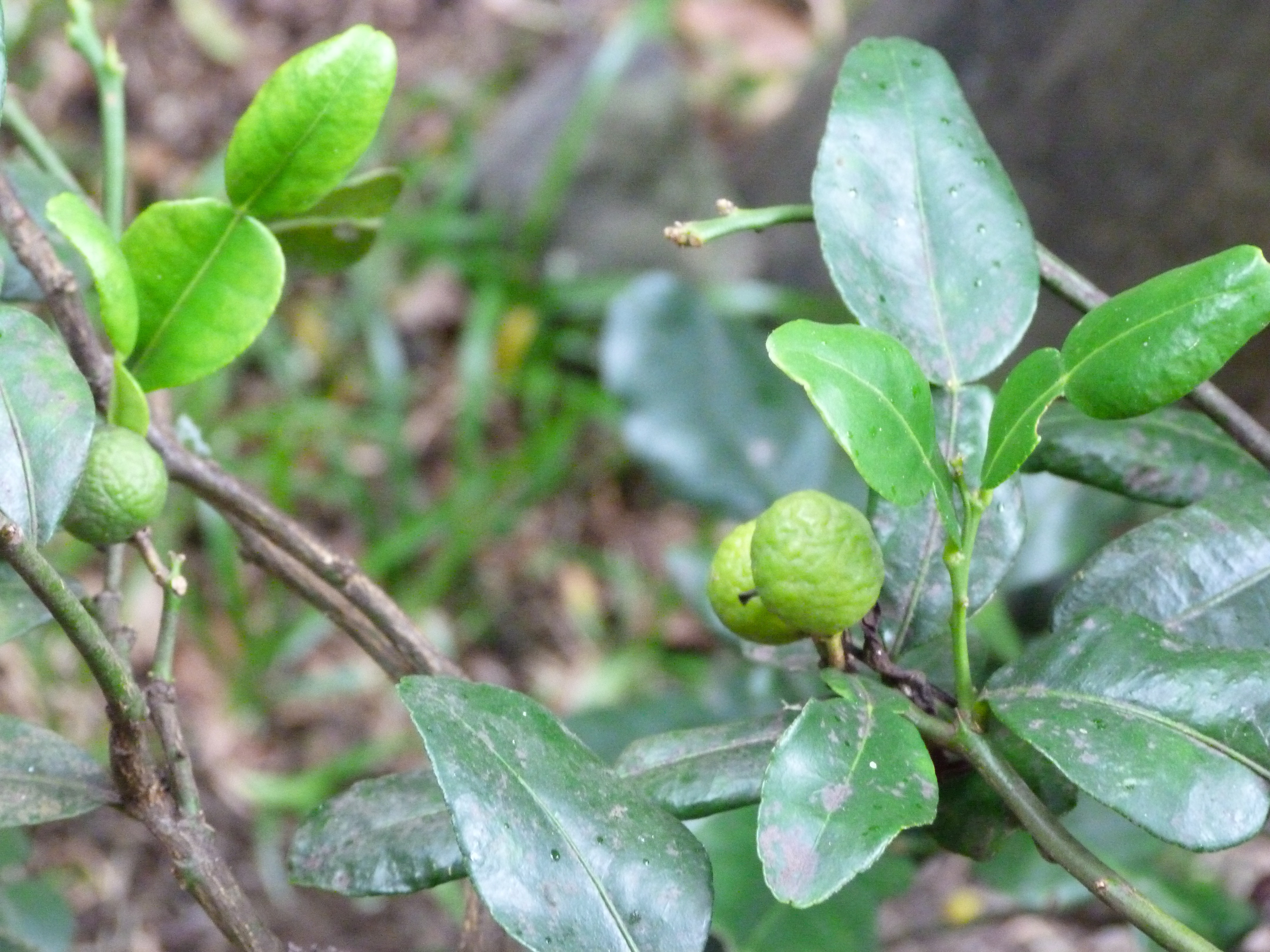 Jardín tropical, lima kaffir o Combava (cítrico hystrix) árbol, la hoja doble y su fruto.