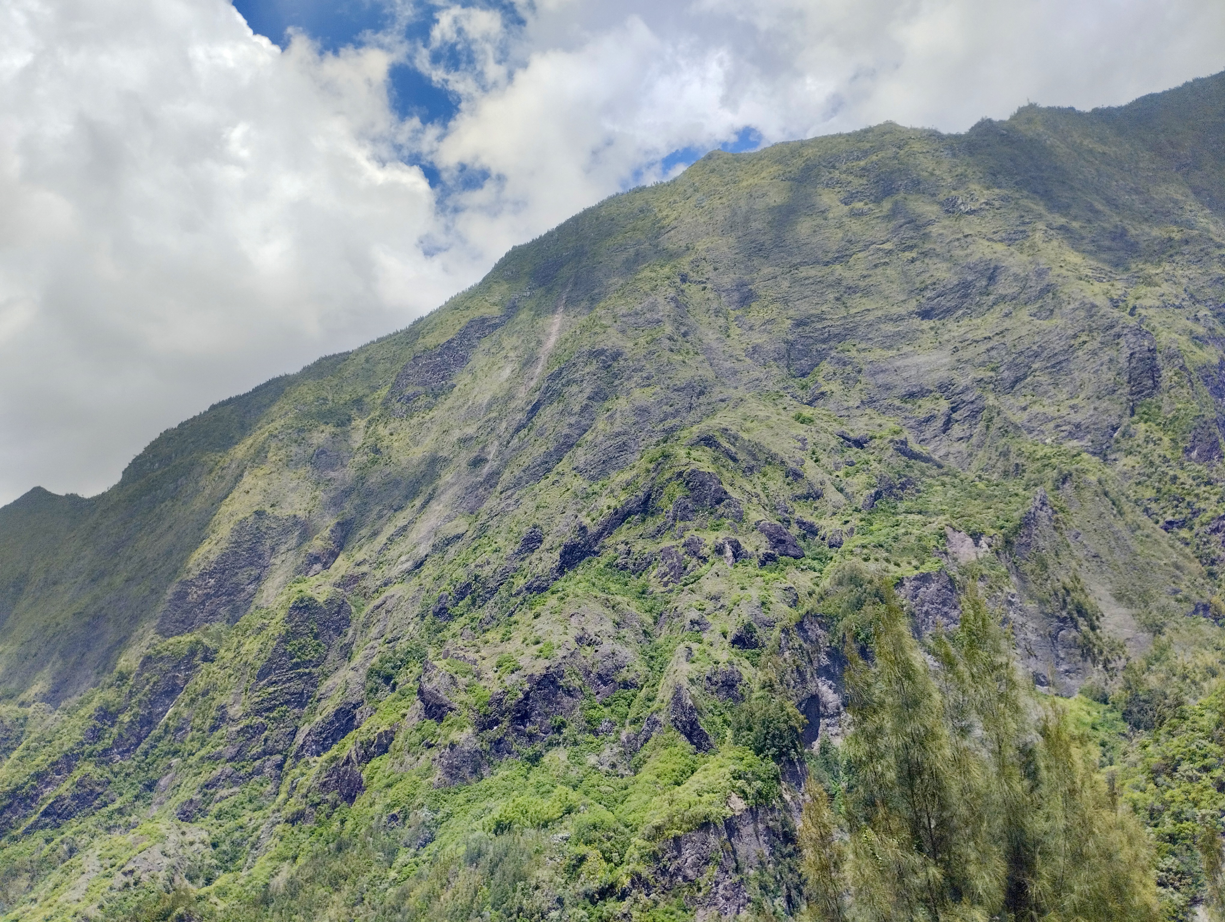 Paisaje de la isla de Reunion donde se visualiza el sistema montañoso y la vegetación.