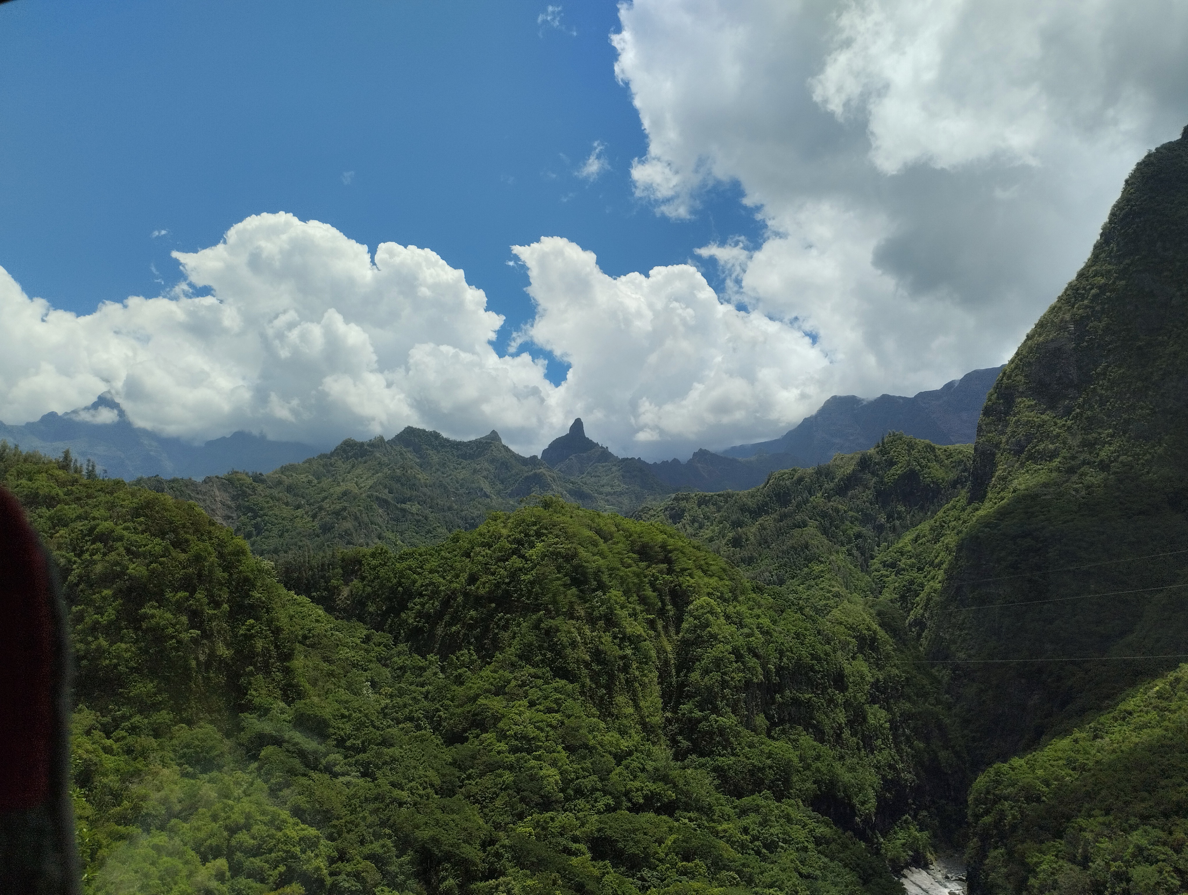 Paisaje de la isla de Reunion donde se visualiza el sistema montañoso y la vegetación.