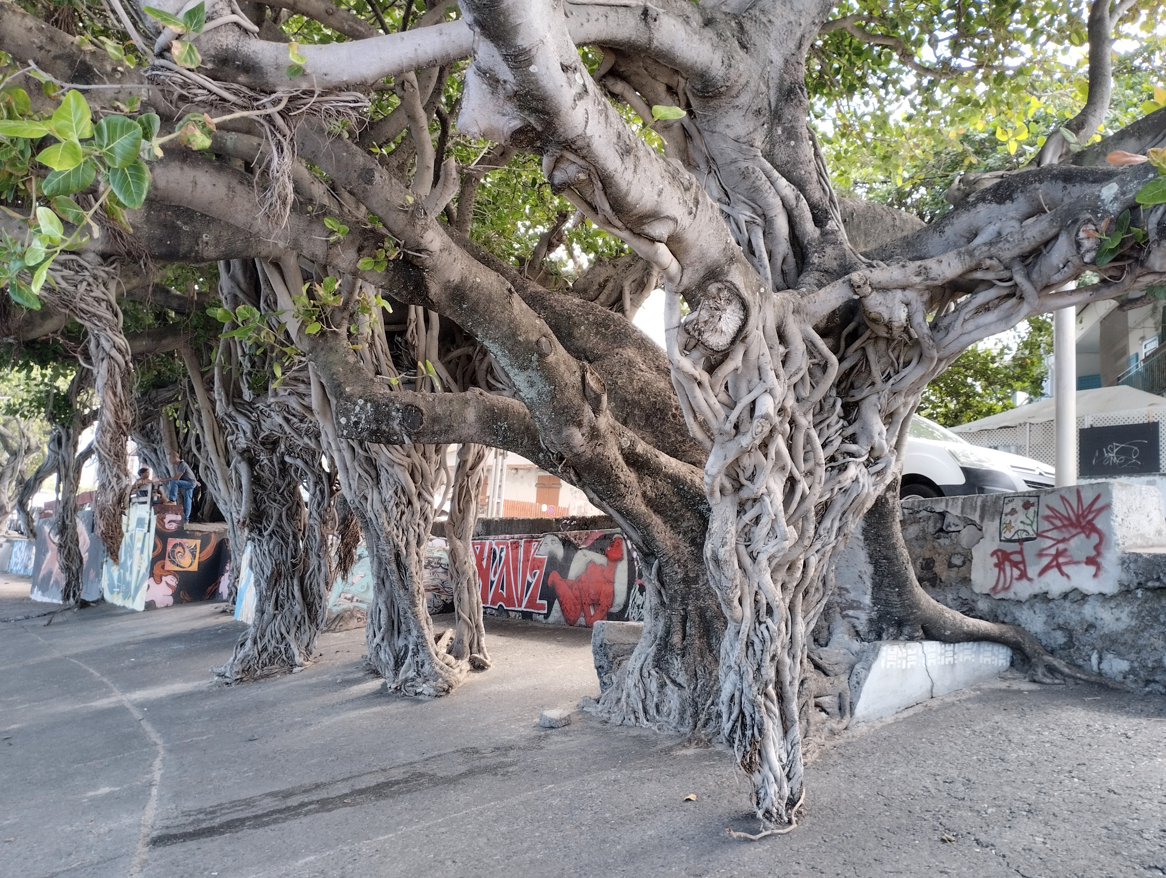 Árboles tropicales en la playa de raíces negras en la isla de la Reunión, Francia.