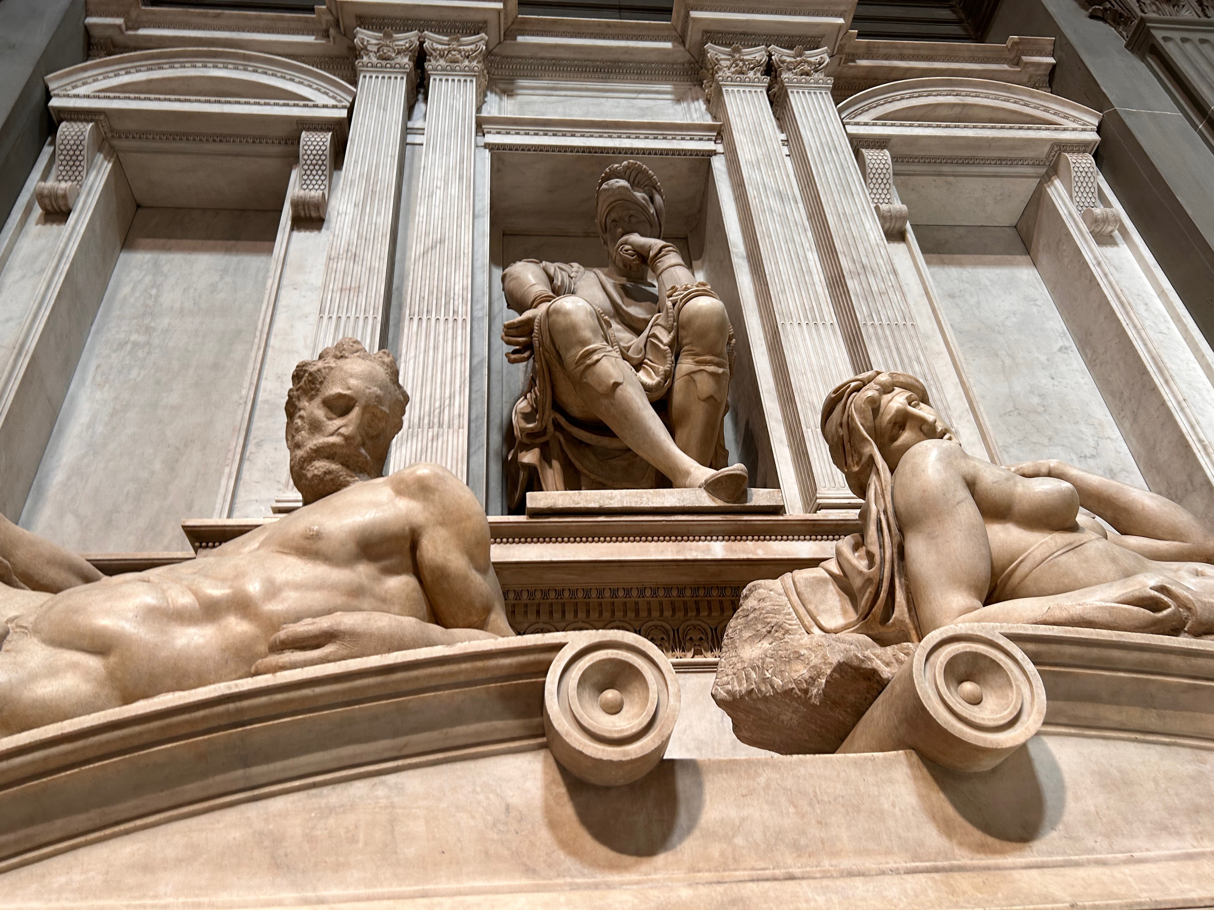 Tumba de Lorenzo de Medici con la Aurora y el ocaso realizado por Michelangelo utilizando Mármol. Se encuentra en el Interior de la capilla de los Medici
