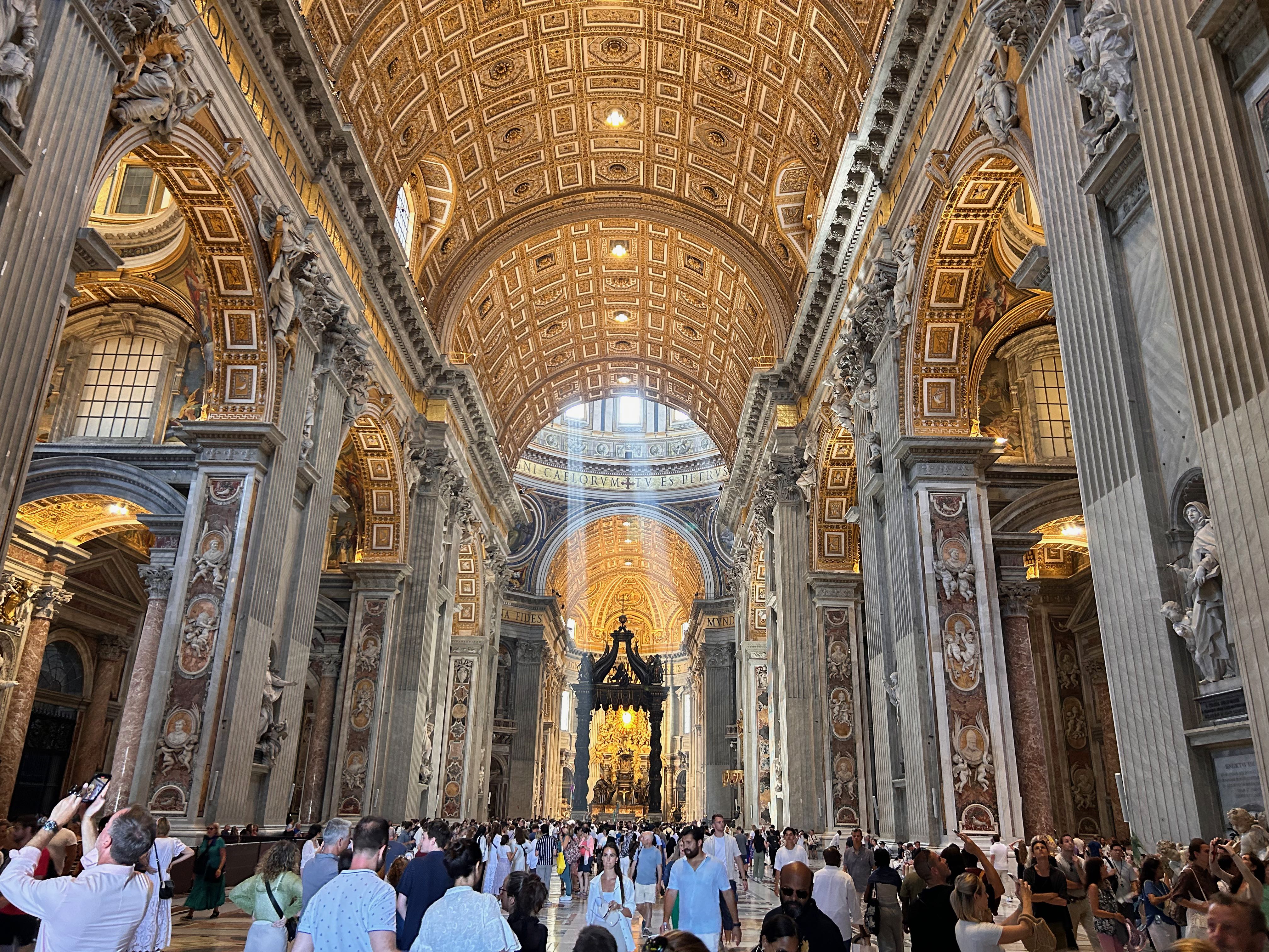 Interior de la Basílica de San Pedro, en el Vaticano. La basílica cuenta con el mayor espacio interior de una iglesia cristiana en el mundo,2​ presenta 193 m de longitud, 44,5 m de altura, y abarca una superficie de 2,3 hectáreas. La altura que le confiere su cúpula hace que su figura domine el horizonte de Roma. Es considerada como uno de los lugares más sagrados del catolicismo.