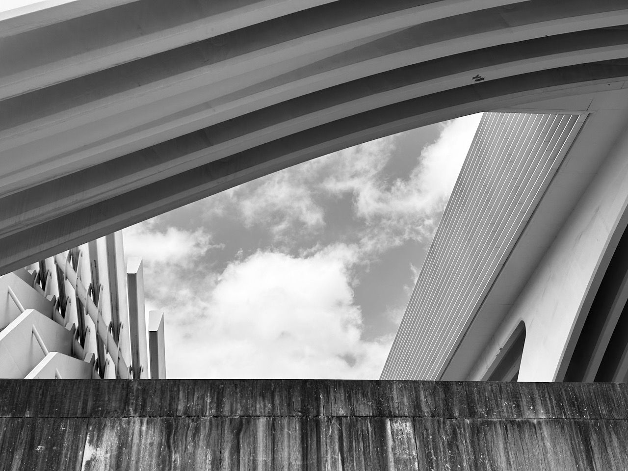 Fotografía en blanco y negro, detalle del exterior, fachada del Palacio de Exposiciones y Congresos de Oviedo, obra del arquitecto valenciano Santiago Calatrava.