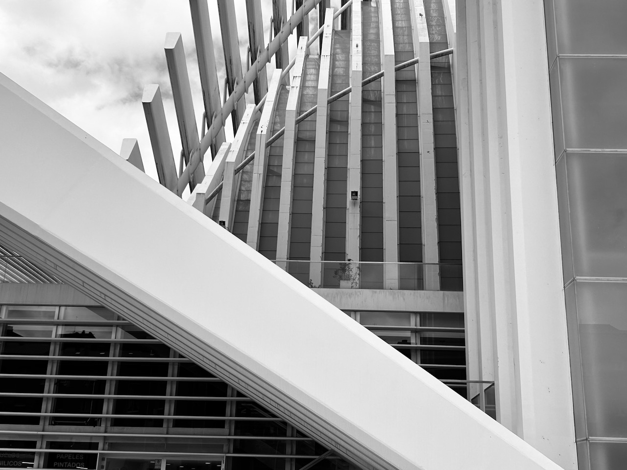 Fotografía en blanco y negro, detalle del exterior, fachada del Palacio de Exposiciones y Congresos de Oviedo, obra del arquitecto valenciano Santiago Calatrava.