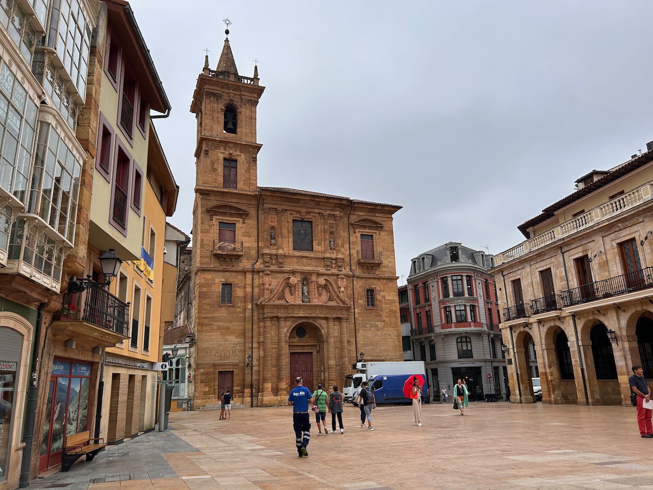 Exterior, fachada de la Iglesia de San Isidoro el Real en Oviedo. Vista de la Plaza de la Constitución y vista parcial del Ayuntamiento.