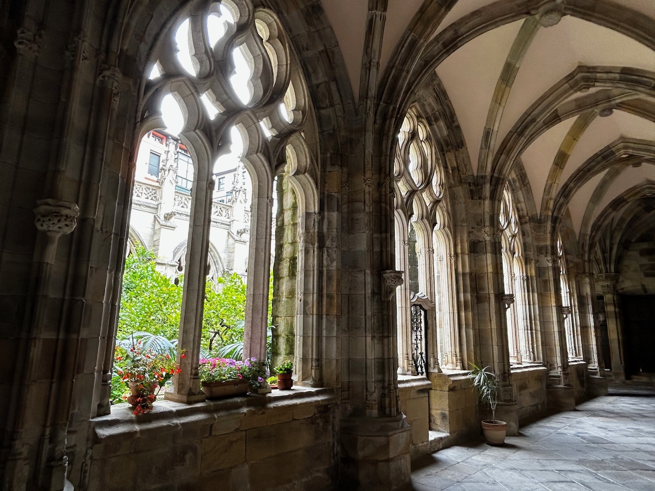 Interior del claustro de la Catedral Basílica de Santiago en Bilbao. Vista ventanas y bóveda de crucería.