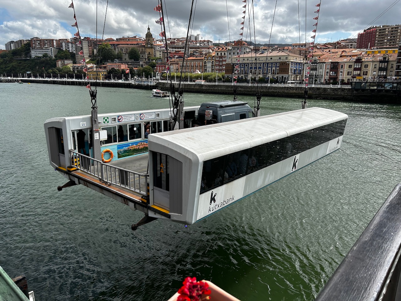 Vista del Puente de Vizcaya, también conocido como Puente Bizkaia, Puente colgante, Puente de Portugalete, o Puente colgante de Portugalete, es un puente transbordador de peaje, concebido, diseñado y construido por iniciativa privada entre 1887 y 1893, que une las dos márgenes de la ría de Bilbao en Vizcaya.