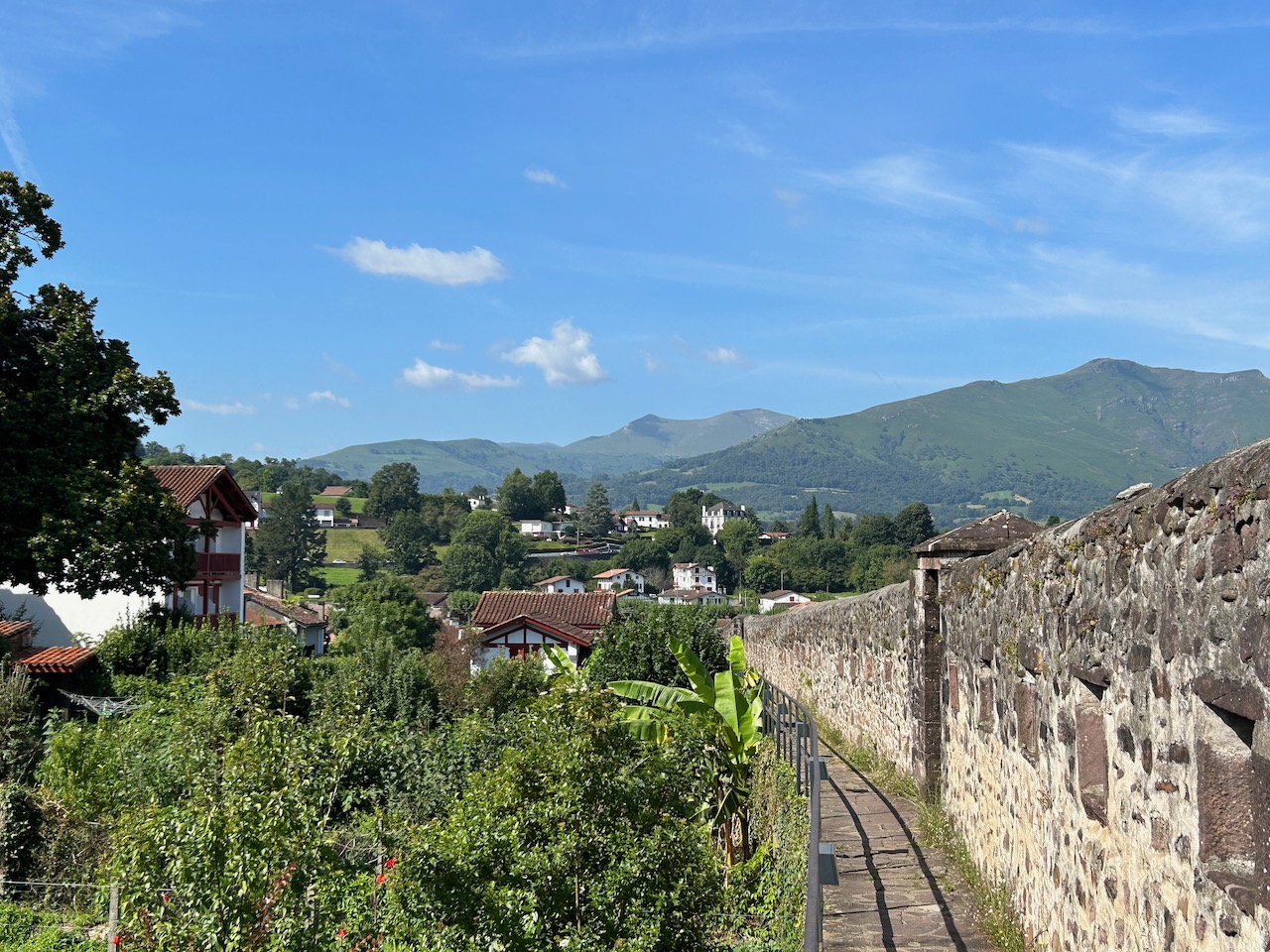 Muro de la ciudadela de Mendiguren en Saint Jean Pied de Port. Desde ahí, puedes disfrutar de las bonitas vistas del pueblo y la naturaleza a su alrededor, con las montañas al fondo. La ciudadela fue construida en 1628 por Antoine de Ville.