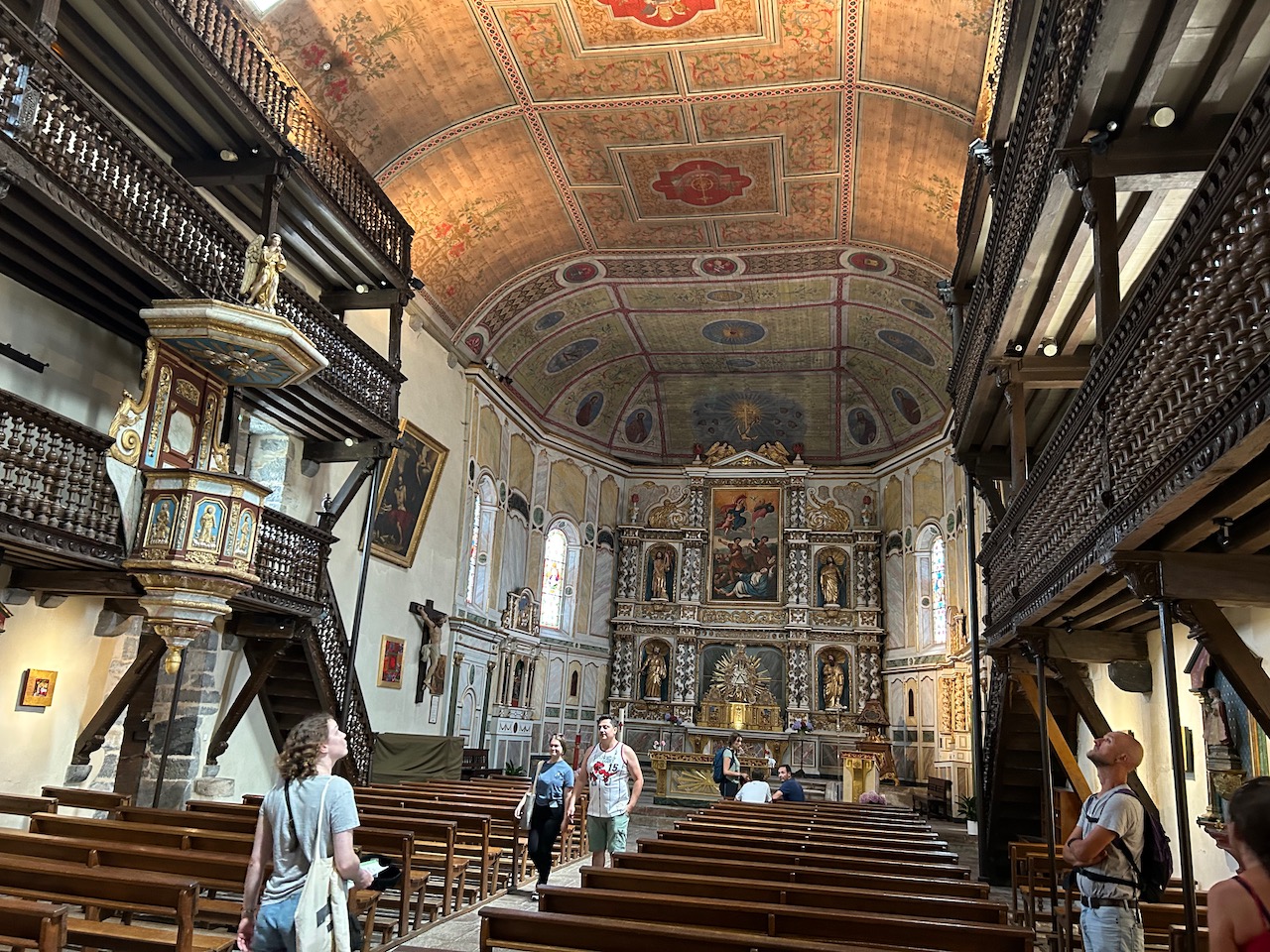 Galería de madera de tres pisos construida entre el siglo XVI Y XVIII en la Iglesia de Saint-Etienne. Al fondo se puede visualizar el altar mayor.