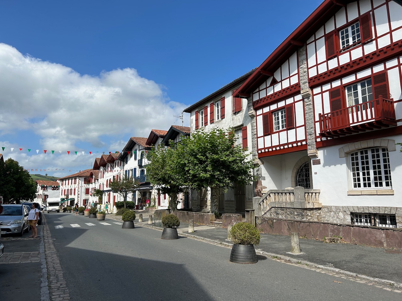 Pueblo de Francia en el que se visualiza un caserío o Maison Moulis, ejemplo de la arquitectura tradicional vasca con sus entramados de madera pintados en rojo.