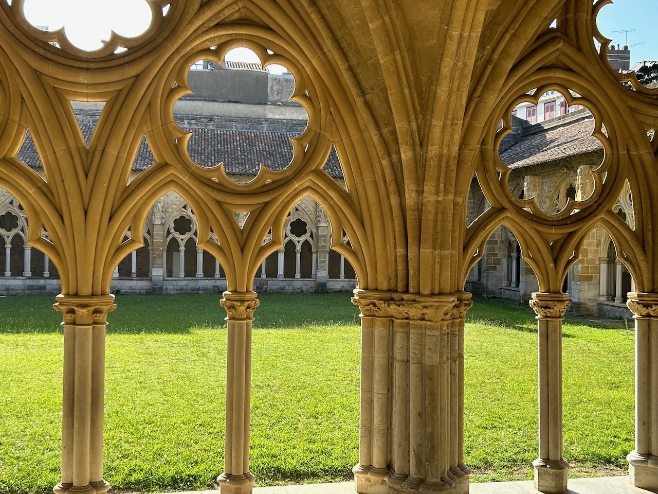 Vista del claustro de la Catedral de Bayona a través de las columnas y arcos.