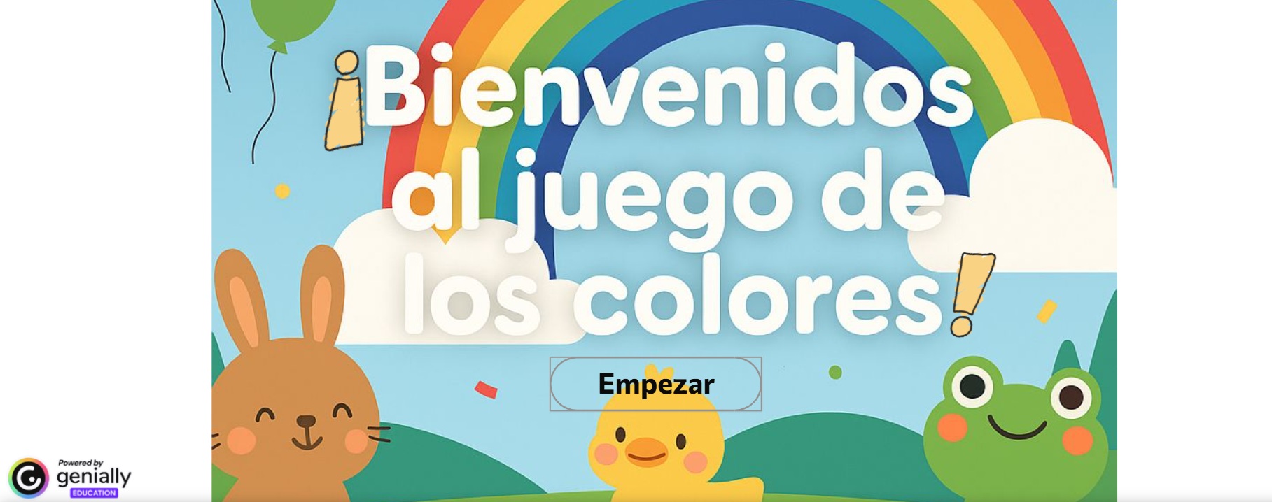 Recurso digital interactivo diseñado en Genially, dirigido al alumnado de 3 años. Permite descubrir los colores de forma multisensorial. Cuenta con elementos visuales animados, audios explicativos y narración. Pensado para trabajarse en PDI con guía docente. Incluye elementos de accesibilidad e inclusión como texto ampliado y narraciones alternativas. https://view.genially.com/6808a3b7d8090e580e410b2b/presentation-de-que-color-es