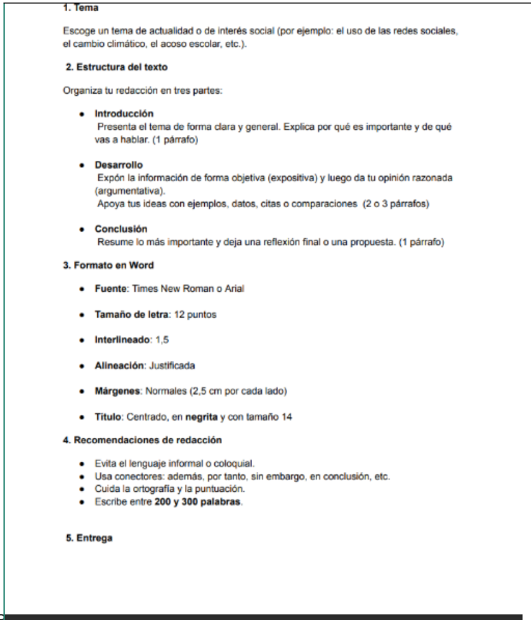 Los alumnos deberán redactar un texto expositivo-argumentativo sobre un tema previamente acordado en clase o de libre elección, siguiendo las instrucciones proporcionadas. En su producción, deberán exponer una idea central o tesis, desarrollar argumentos que la sustenten con información clara, precisa y organizada, y concluir de manera coherente. El texto debe respetar las características formales del género (estructura con introducción, desarrollo y conclusión; uso de conectores lógico-argumentativos; registro formal; cohesión y coherencia) y las características de contenido (presentación de información objetiva, fundamentación de ideas, análisis crítico, incorporación de ejemplos o evidencias).