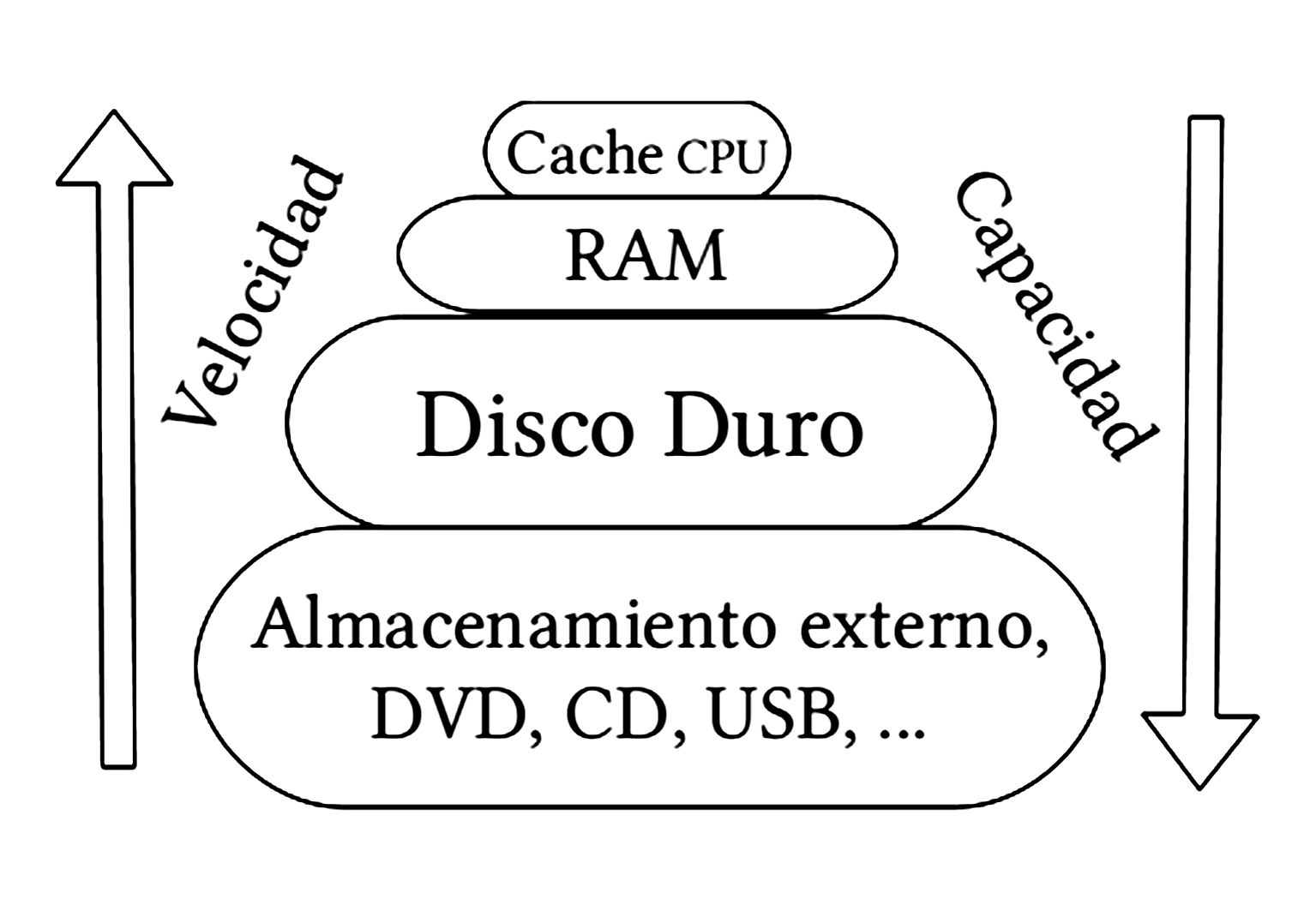 Ilustración de la jerarquía de memoria, es decir, de la organización piramidal de la memoria en niveles que tienen las computadoras