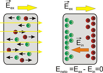 La imagen representa cómo se anula el campo eléctrico en el interior de un conductor en equilibrio electrostático.