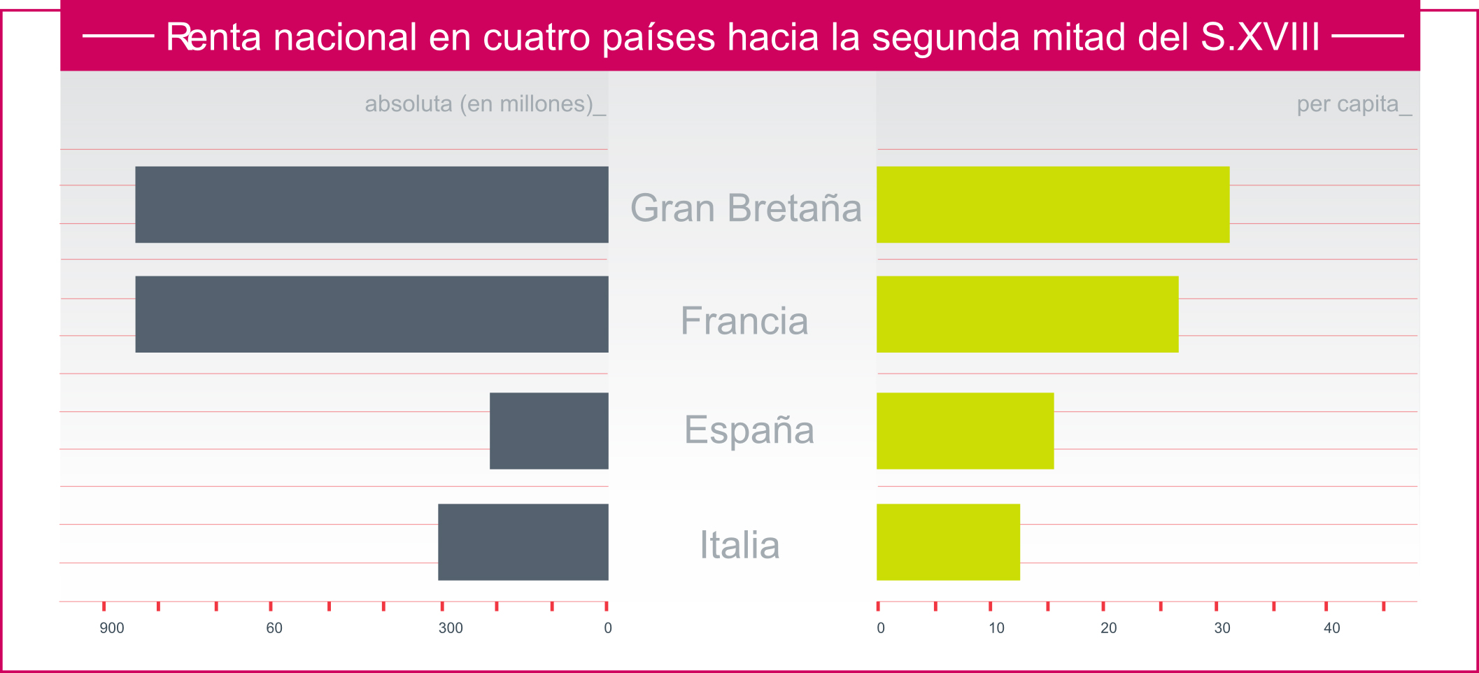 Comparativa de la renta nacional de varios paises europeos a mediados del s. XVIII