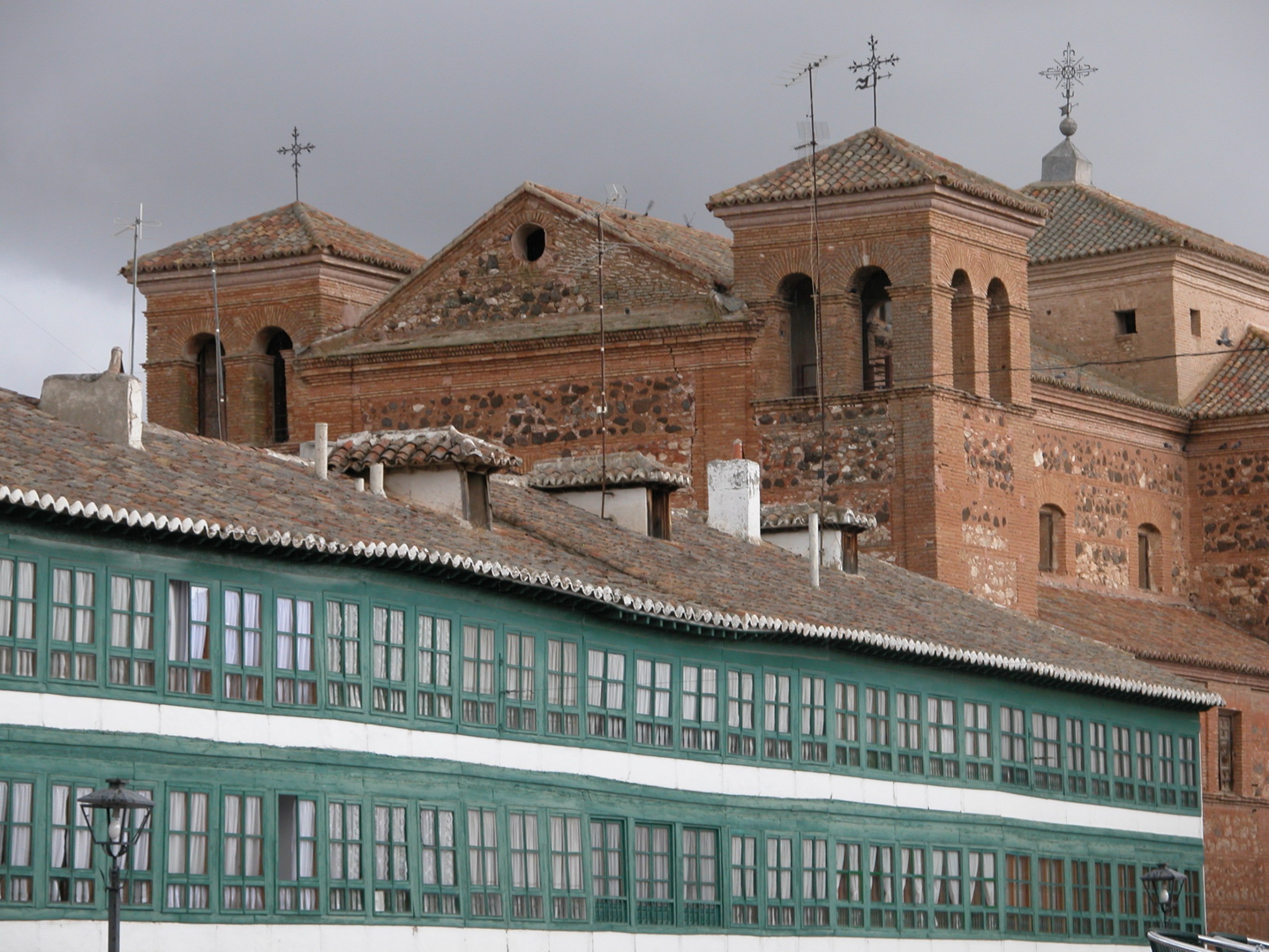 Detalle de la iglesia de San Agustín y de las balconadas de la Plaza Mayor, Almagro, Ciudad Real
