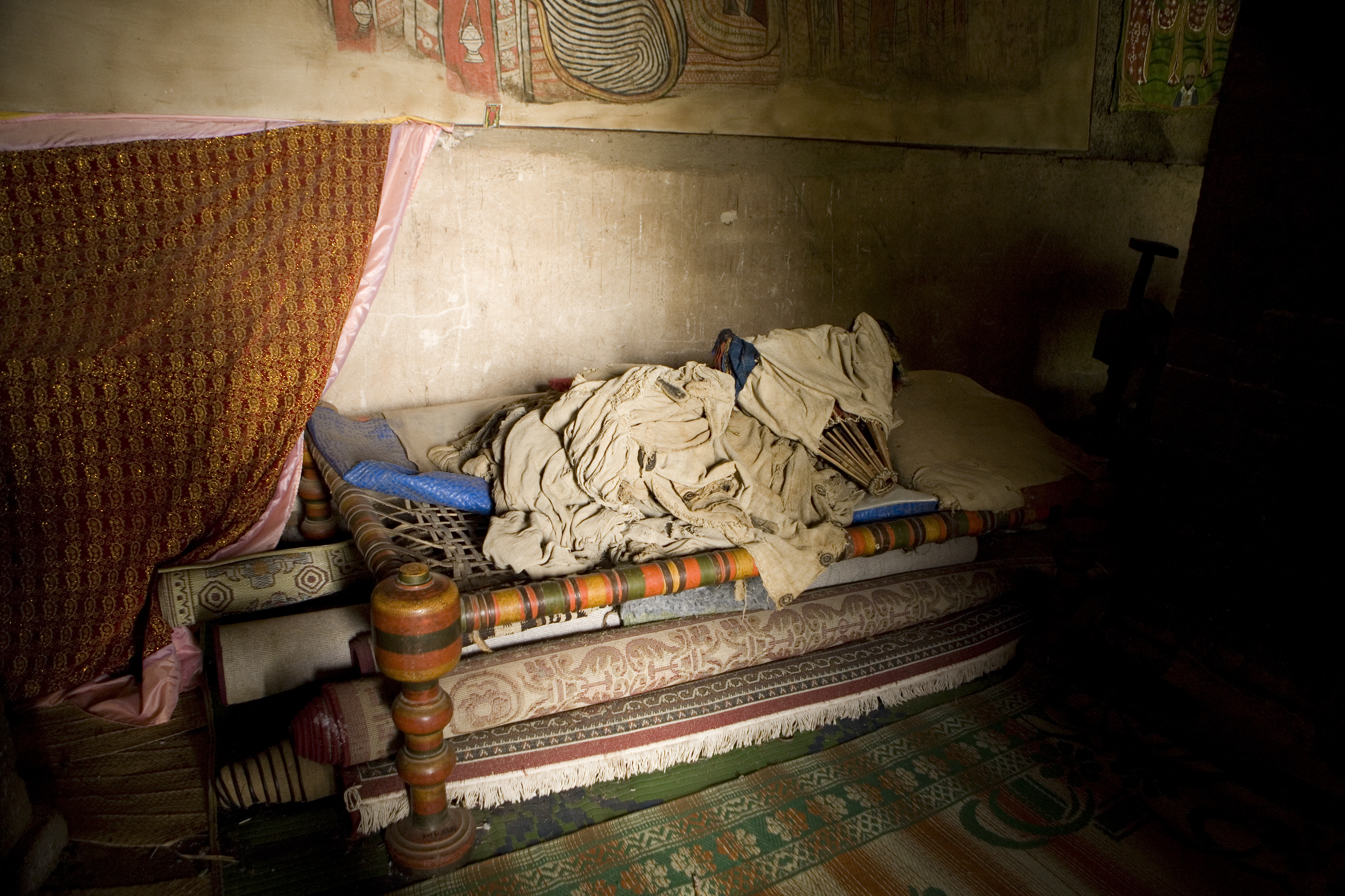 Ropas y alfombras para la oración en el monasterio Kibran Gabriel, Etiopía