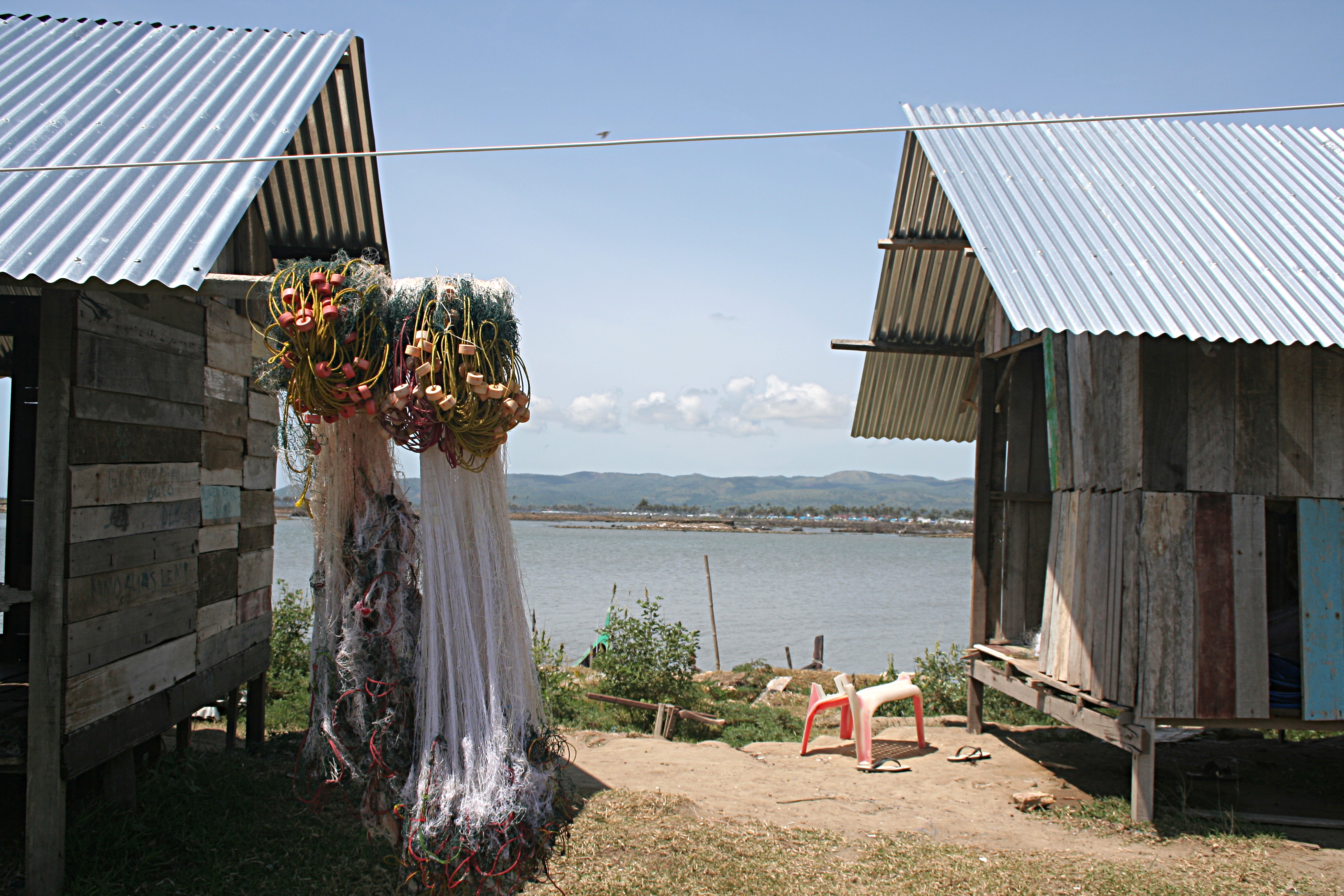 Barracones y redes del campamento de pescado de Alunaga, Sumatra, Indonesia