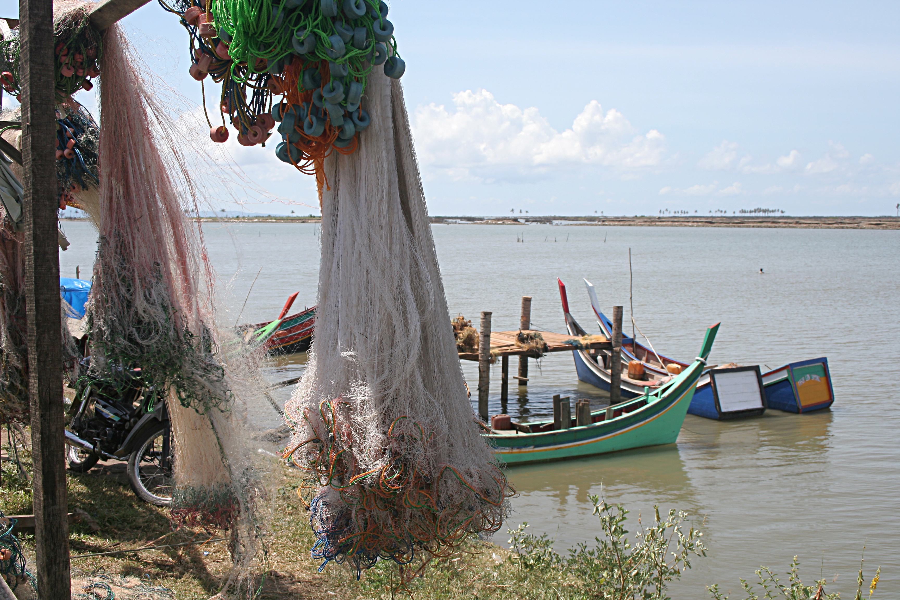 Barcas y redes del campamento de pescado de Alunaga, Sumatra, Indonesia