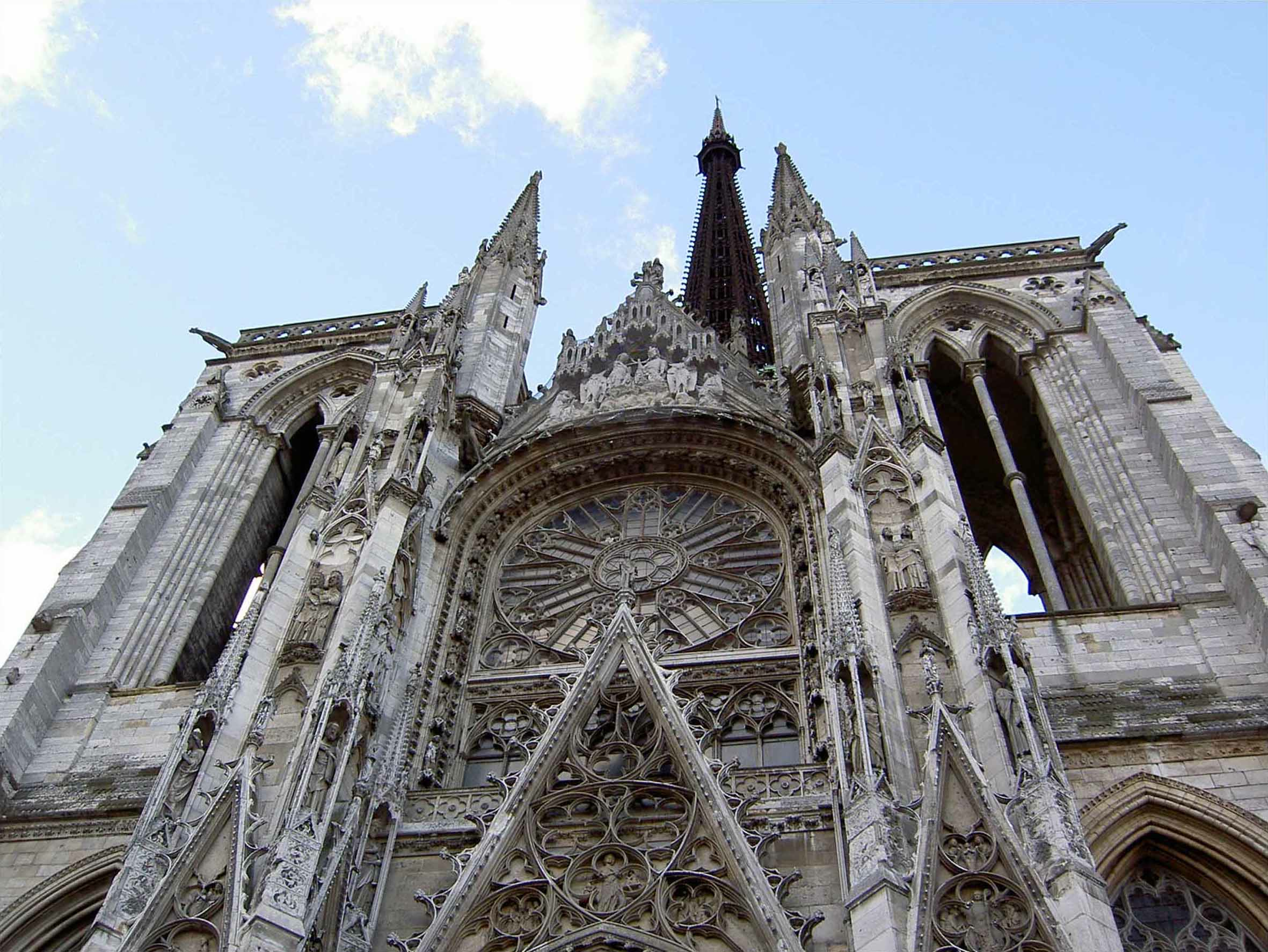 Primer plano de la fachada de la Catedral de Ruan, Francia. Vista del rosetón y pináculos.