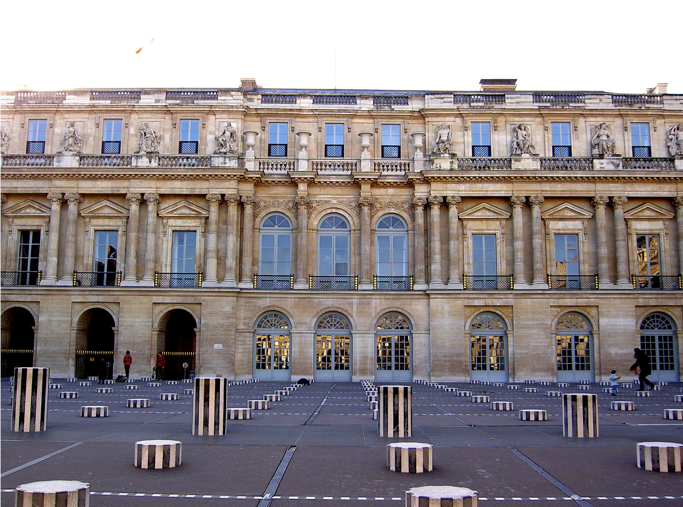 Fachada del Palais Royal de París e instalación de arte al aire libre de Daniel Buren en el Palais Royal de París de finales siglo XX, llamada Les Deux Plateaux o Colonnes de Buren, consistente en columnas cortas en blanco y negro repartidas por el patio.