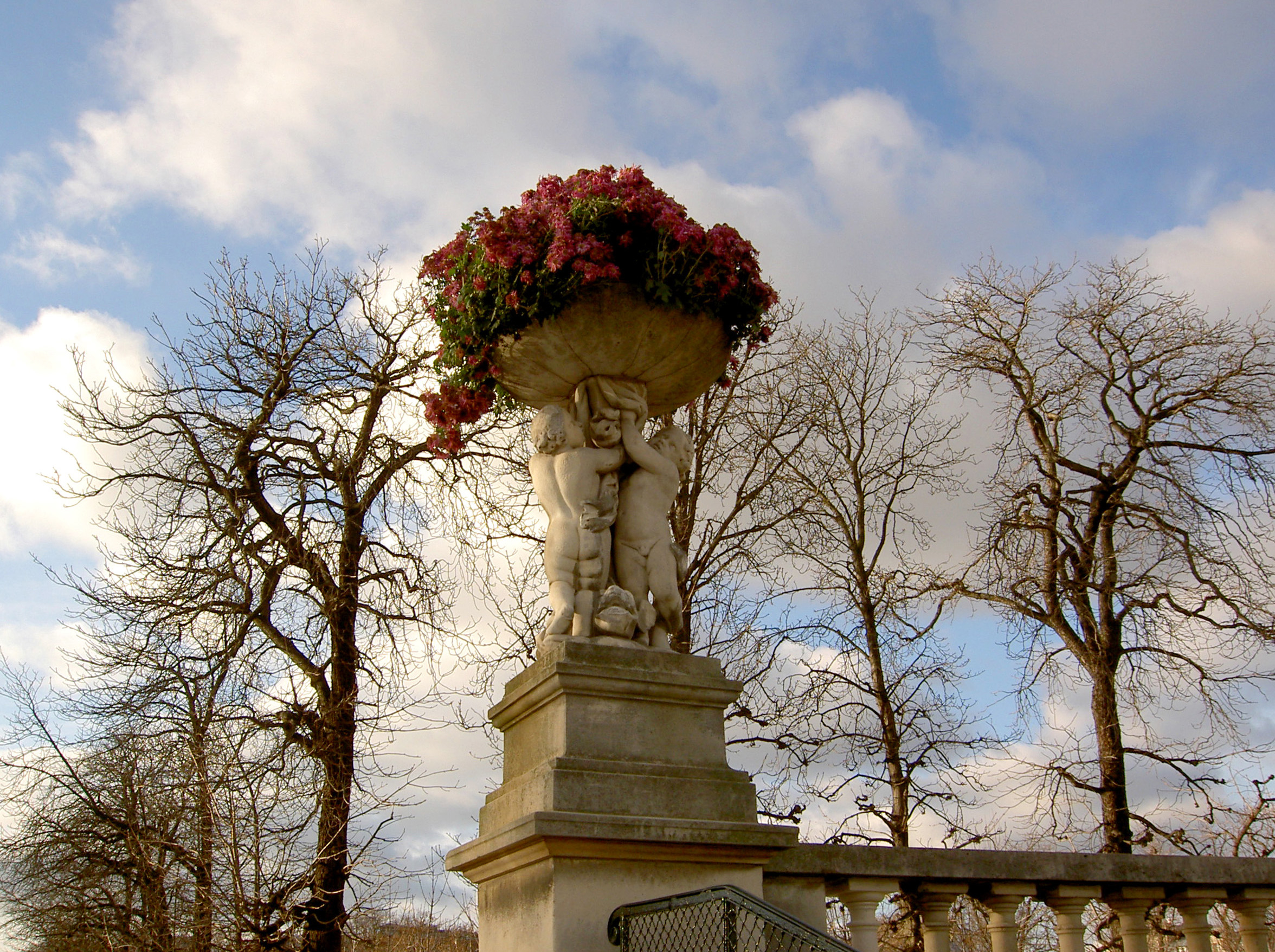 Vista de una escultura con maceta y flores de los Jardines de Luxemburgo en París, Francia.