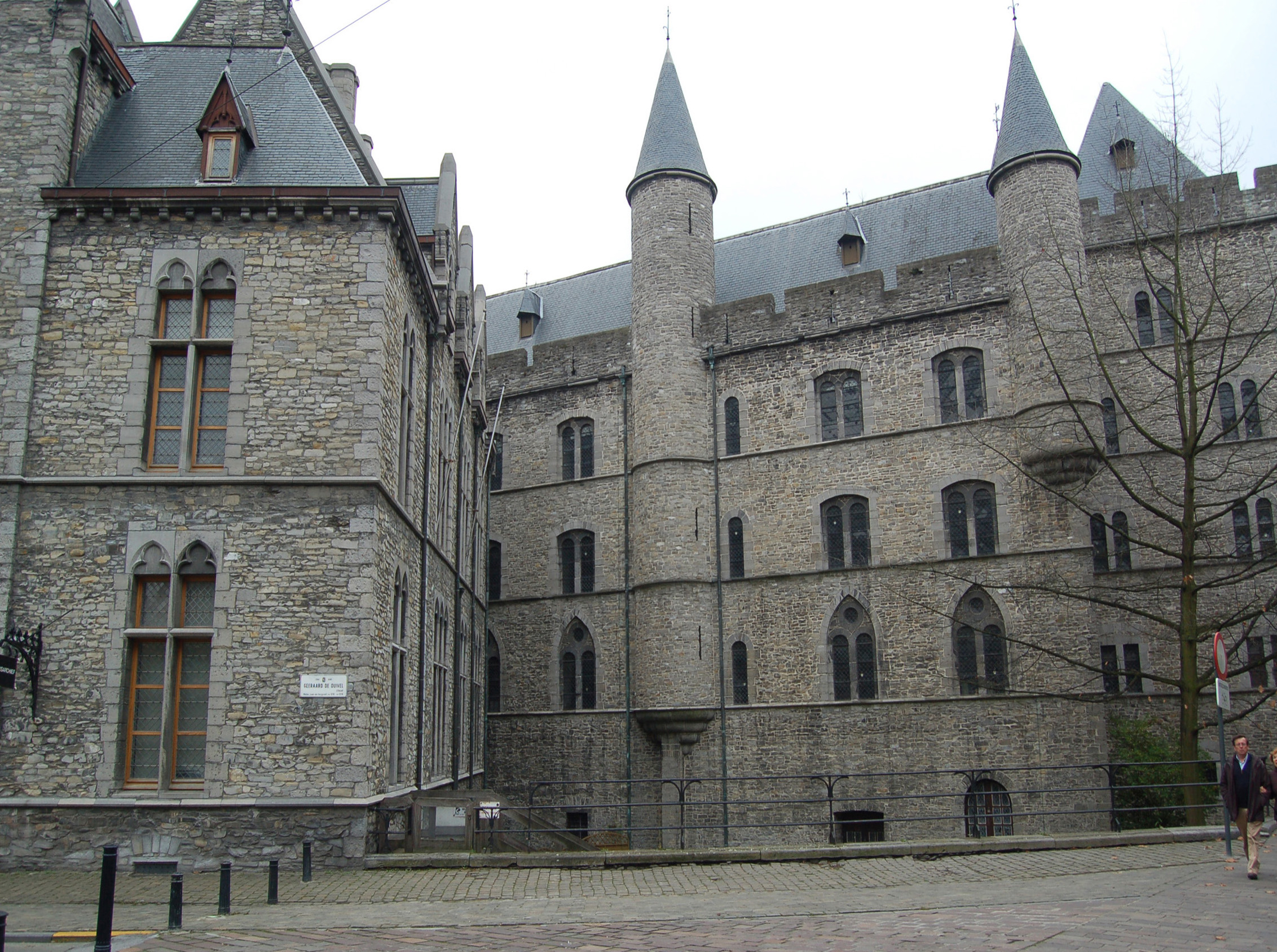 Fachada del Castillo de Gerardo El Diablo o Geeraard de Duivelsteen, situado en el centro histórico de Gante, junto al río Escalda. Es de principios del siglo XIII.