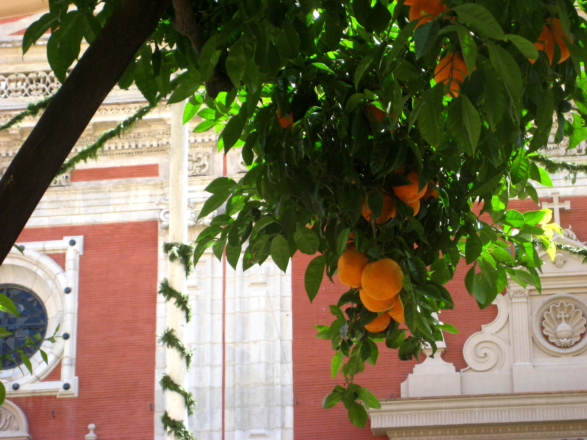 Detalle de la fachada de la Iglesia Colegial del Divino Salvador de Sevilla y naranjas.