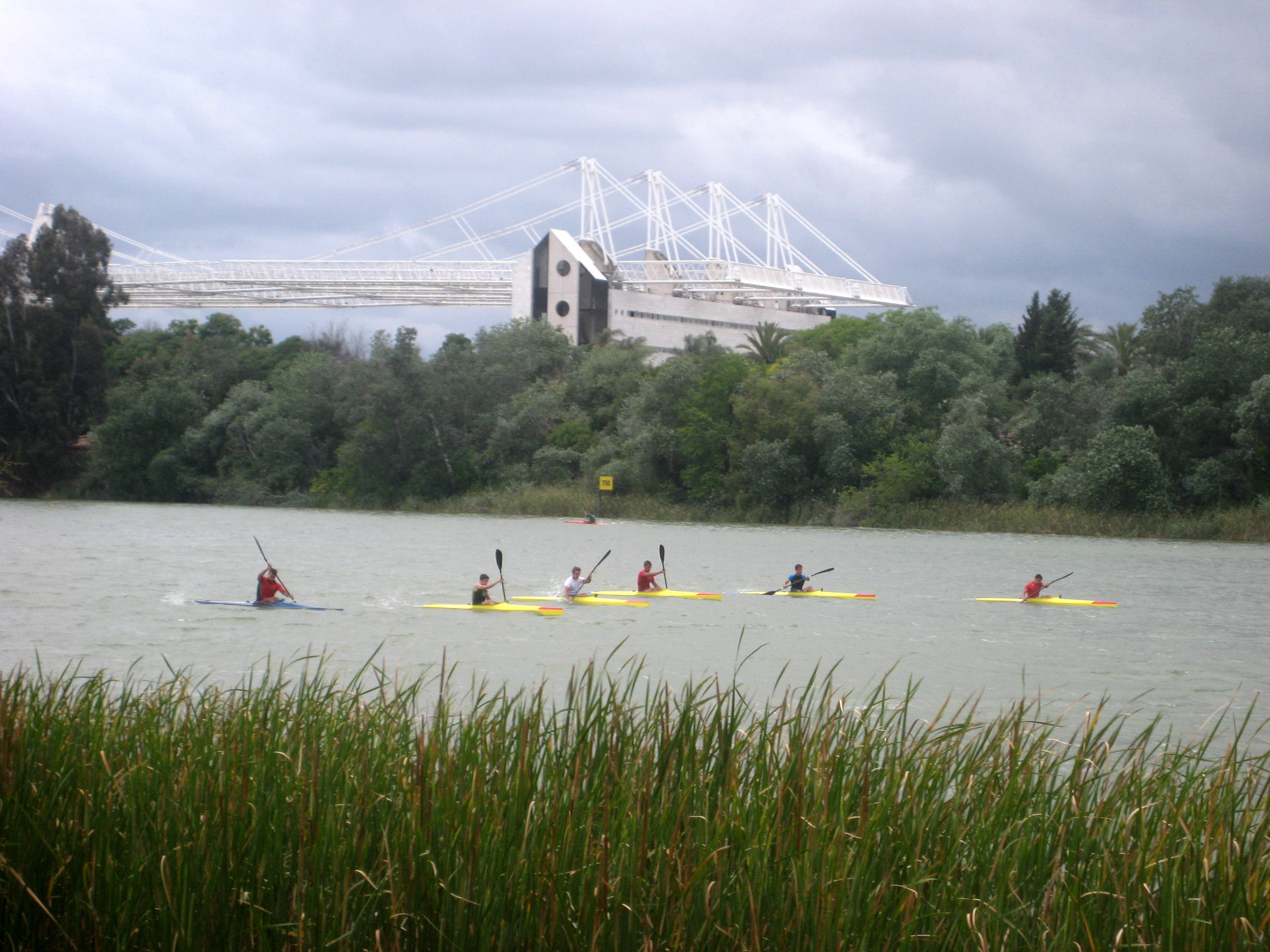 Gente haciendo piragüismo o montando en piragua en el río Guadalquivir a su paso por Sevilla.
