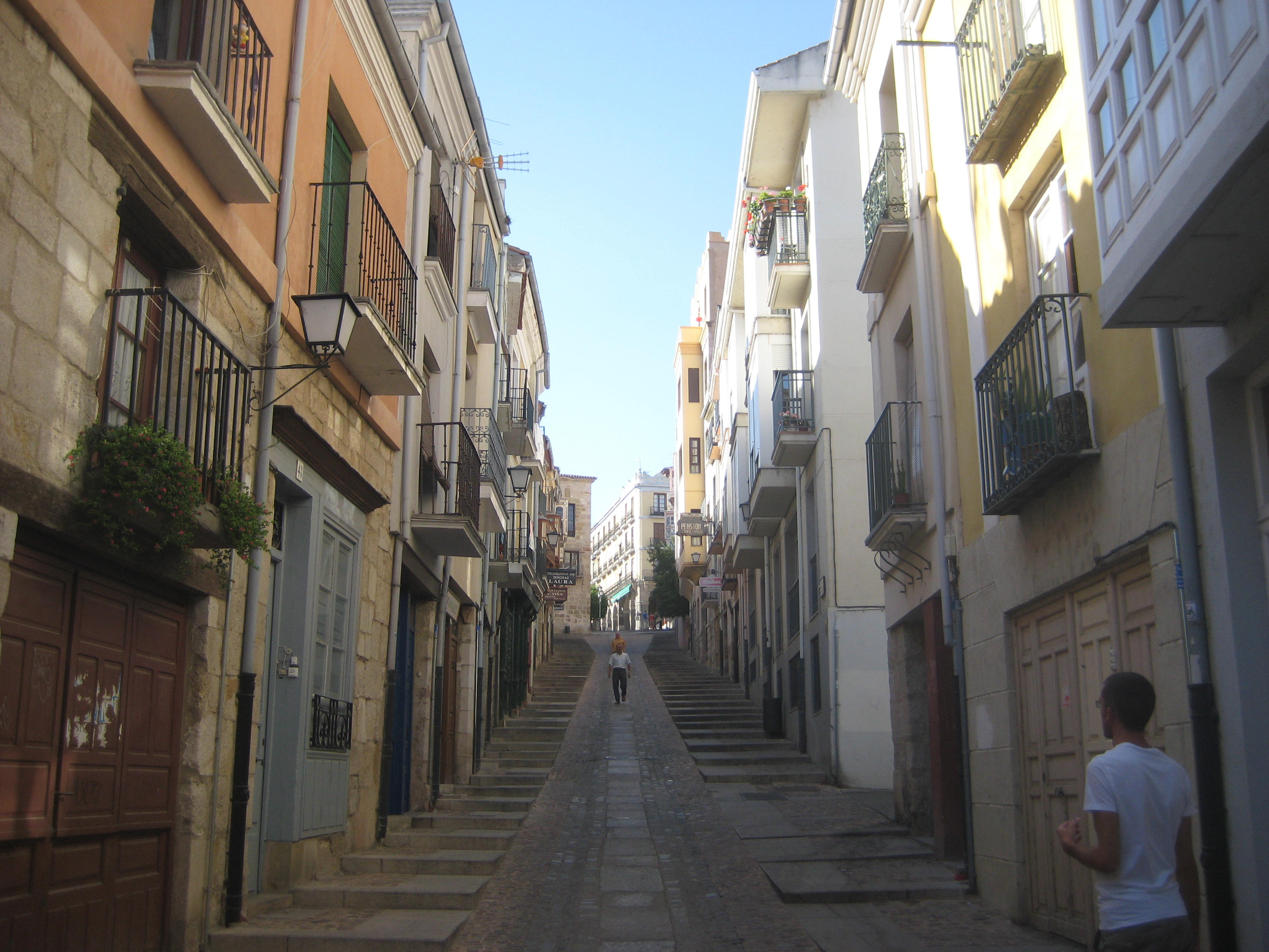Vista de calle cuesta arriba, tiendas y fachadas de casas en Zamora.