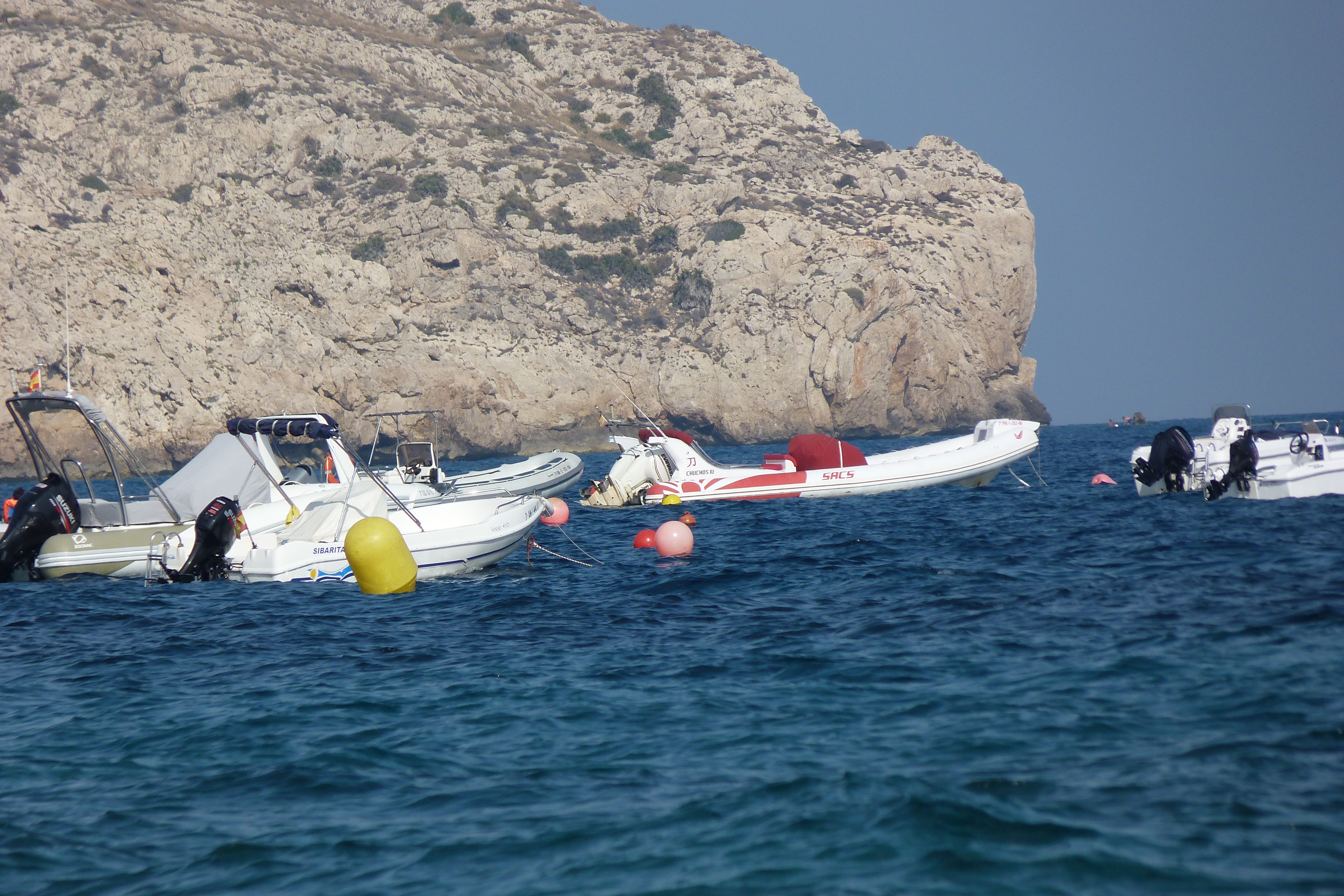 Lanchas en Agua Amarga, Almería. Siendo Agua Amarga uno de los núcleos más poblados y frecuentados por el turismo en el parque natural Cabo de Gata-Níjar, su playa urbana es una de las más concurridas del entorno.