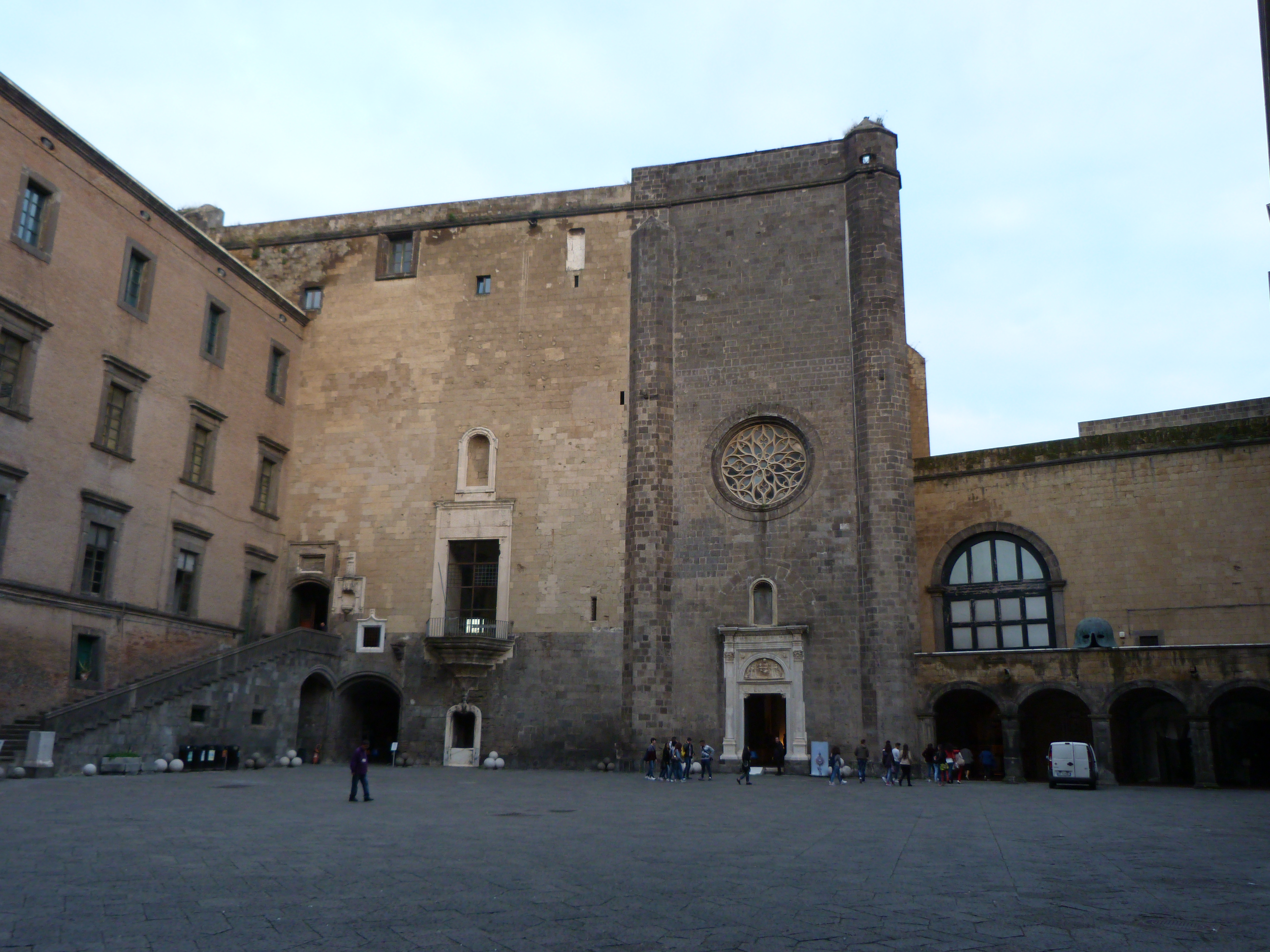 Parte trasera del Castel Nuovo (Castillo Nuevo), conocido popularmente como Maschio Angioino, es un castillo medieval italiano construido en la ciudad de Nápoles.