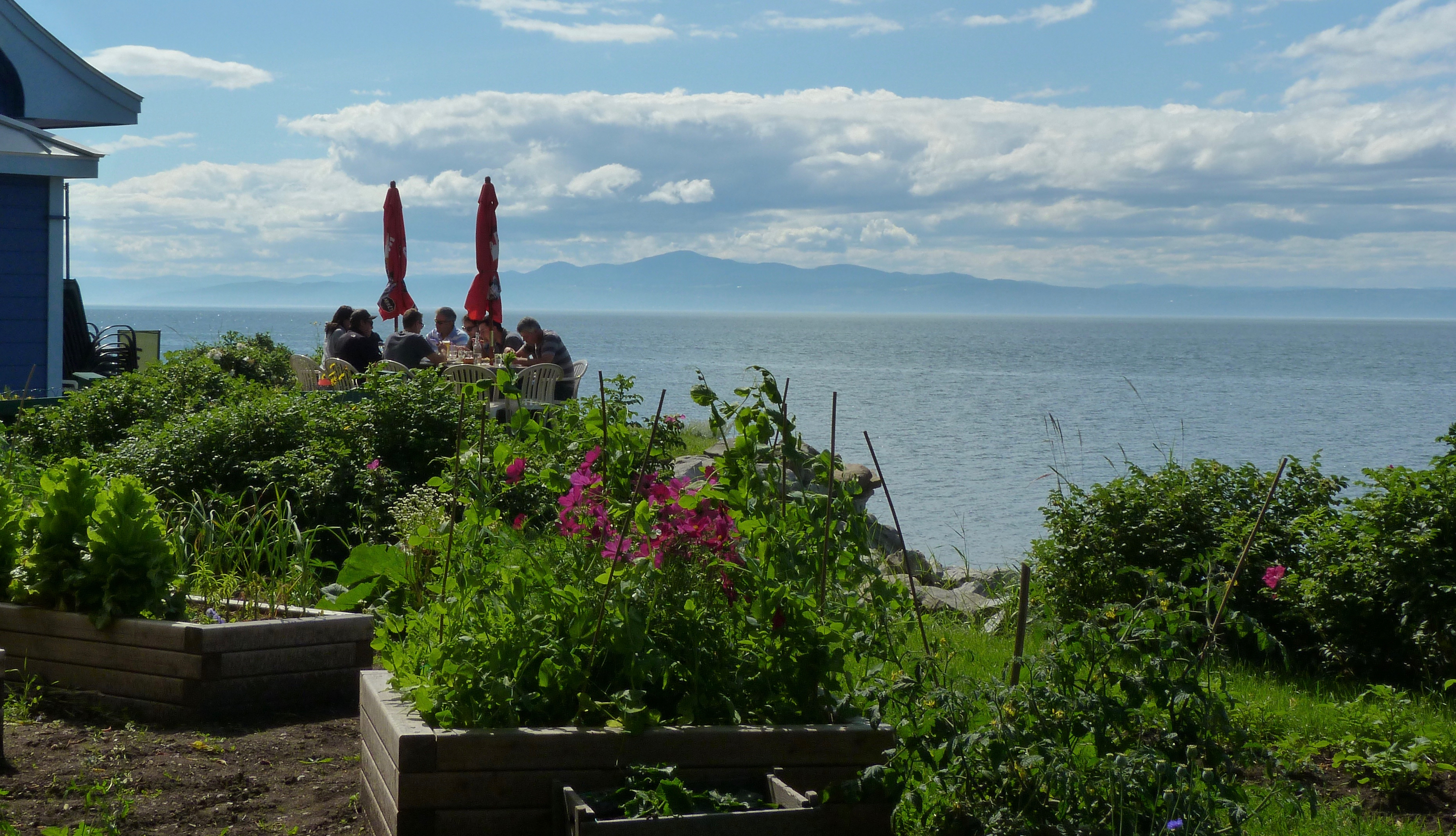 Río San Lorenzo en la ciudad de Kamouraska. Personas comiendo en una terraza y paisaje natural