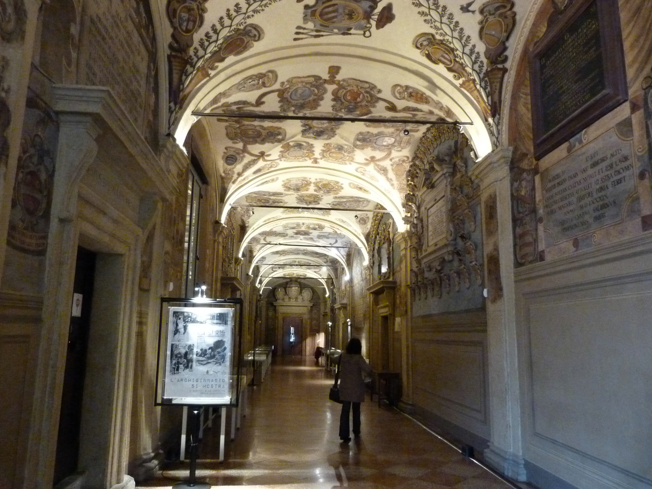 Galeria superior de la biblioteca del archigimnasio en Bolonia.