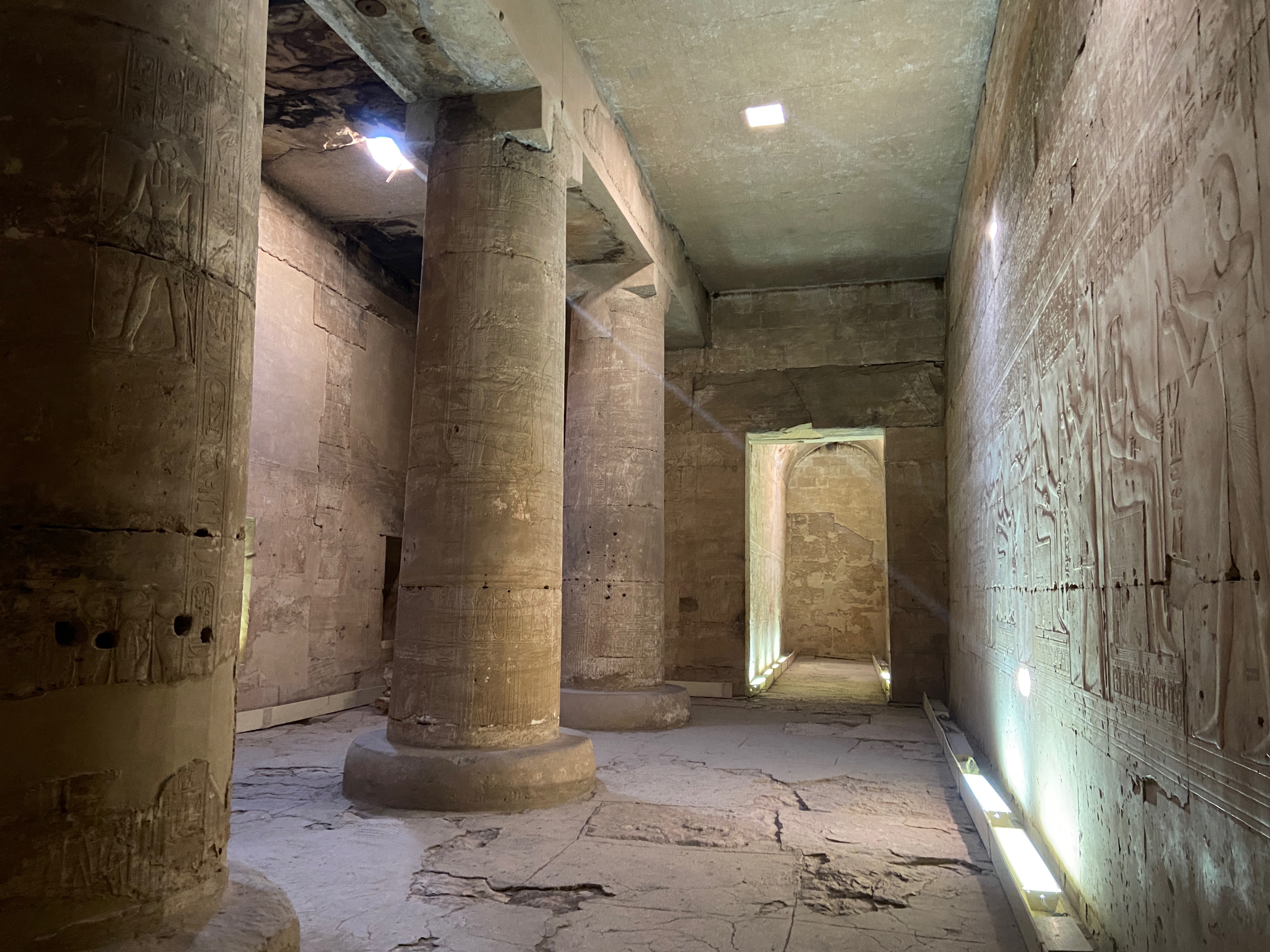 Interior del templo de Setis I en Abydos. El templo funerario de Seti I, también conocido como Gran Templo de Abidos o Memnonium (como deformación de «Men-Maât-Rê», nombre de coronación de Seti I) es un templo-cenotafio construido por el faraón Seti I en Abidos, en el Alto Egipto, y que sería finalizado por su hijo Ramsés II, también de la XIX dinastía. Completado por el cercano Osireion, el templo sirve como un monumental ofrecimiento votivo para atraer la benévola atención de Osiris, el dios de la regeneración y soberano del más allá.