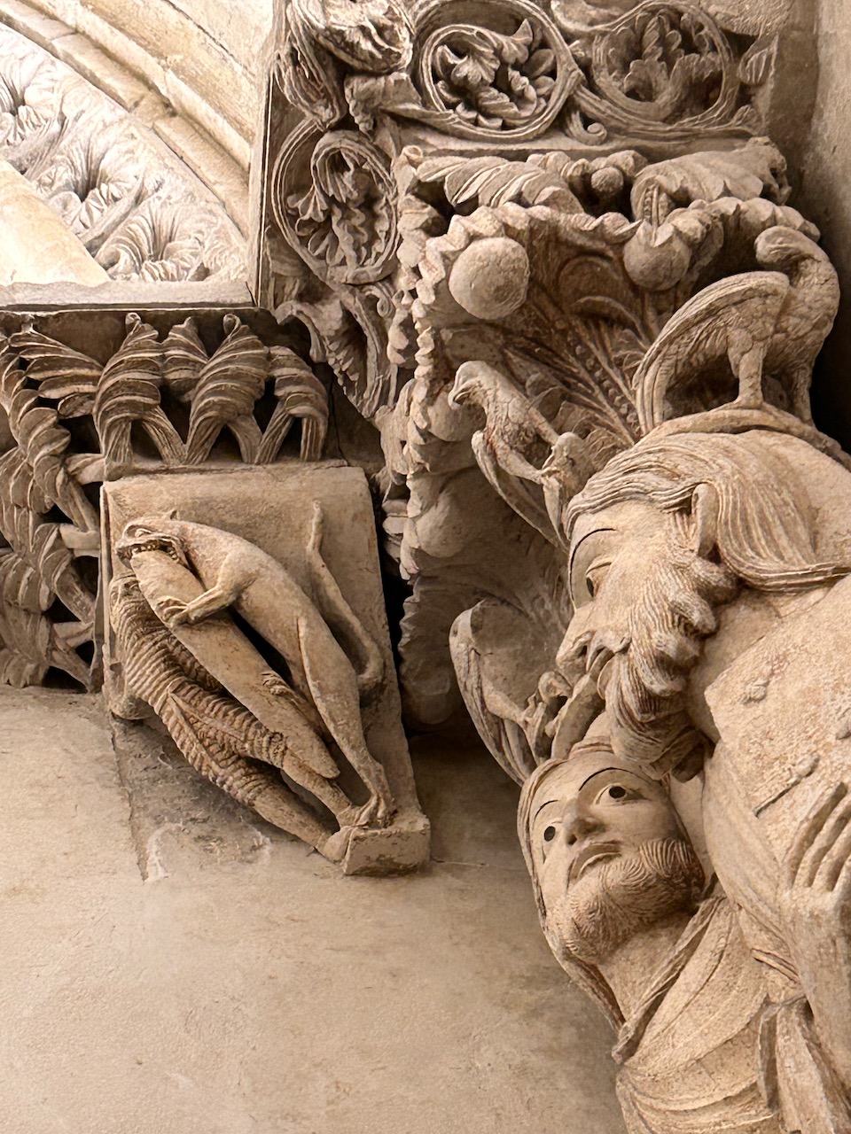 Vista contrapicada del capitel de Santiago el menor y San Felipe situadas en el piso alto de la Cámara Santa de la Catedral de Oviedo.