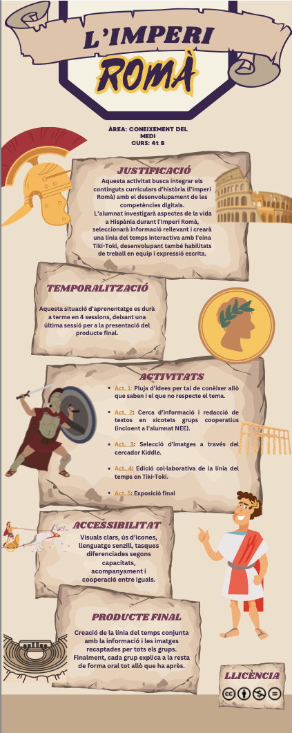 Activitat didàctica per a l’alumnat de 4t de Primària en l’àrea de Coneixement del Medi. El recurs és una infografia explicativa dissenyada per guiar una situació d’aprenentatge sobre l’Imperi Romà. Inclou propostes per a la recerca d’informació, creació d’una línia del temps digital, treball cooperatiu i ús de recursos digitals. L’activitat s’ha planificat per atendre la diversitat i desenvolupar la competència digital mitjançant Tiki-Toki, Canva i cercadors segurs com Kiddle.