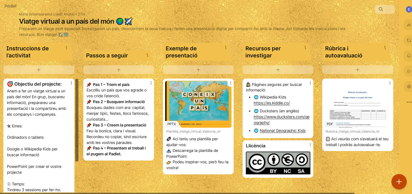Projecte interdisciplinari digital dissenyat per a l’alumnat de 4t de Primària, dins de l’àrea de Coneixement del Medi, Valencià i Competència Digital. Consisteix en l’elaboració d’una presentació i un Padlet sobre un país. Fomenta la creativitat, la cerca d’informació i l’expressió oral, integrant recursos per a la inclusió.