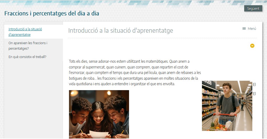 Esta situació d'aprenentatge va adreçada a l'alumnat de 1r d'ESO. En ella es pretén crear un aprenentge significatiu contextualitzant problemes de percentatges i fraccions a situacions de la seua vida quotidiana. Amb la realització de la SA que es planteja al recurs es busca fomentar la cerca en fonts fiables a internet, la responsabilitat compartida al treballar en equip i l'expressió oral.