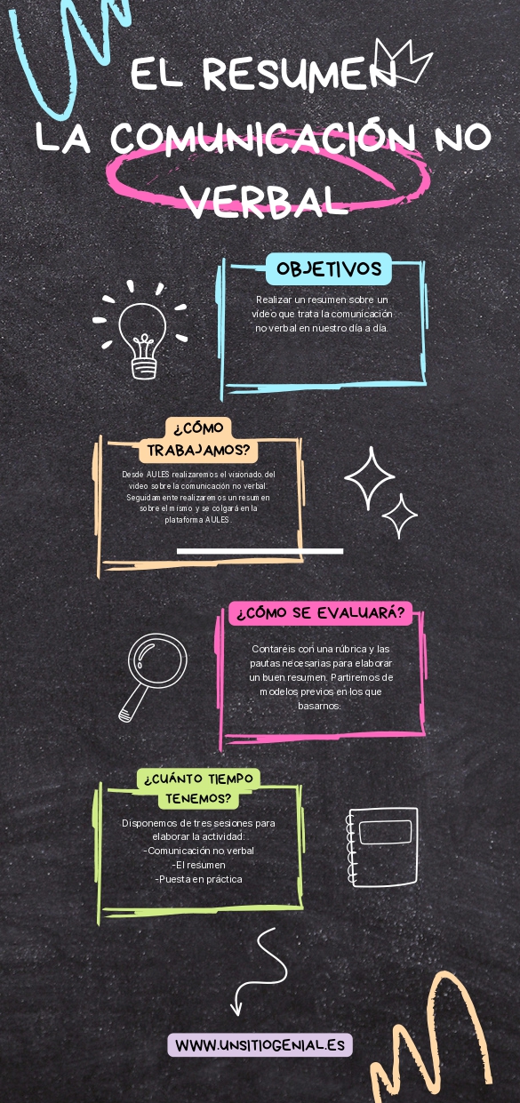 Esta actividad se realiza durante el primer trimestre del curso cuando se estudia la comunicación verbal y la comunicación no verbal. Se trabaja la expresión escrita a través del resumen, para que el alumnado aprenda las particularidades de hacer un buen resumen. Para trabajarlo se realiza el visionado de un vídeo en el que se explica la presencia de la comunicación no verbal en nuestro día a día. Para realizar esta actividad el alumnado dispone de seis días para su entrega. Las fechas comprendidas se ubican desde el 25 de septiembre al 1 de octubre. La realización de esta actividad transcurre durante 3 sesiones. Se explica qué es la comunicación, sus tipos, tanto verbal como no verbal. Se trabajan las características del resumen y se ponen en práctica.