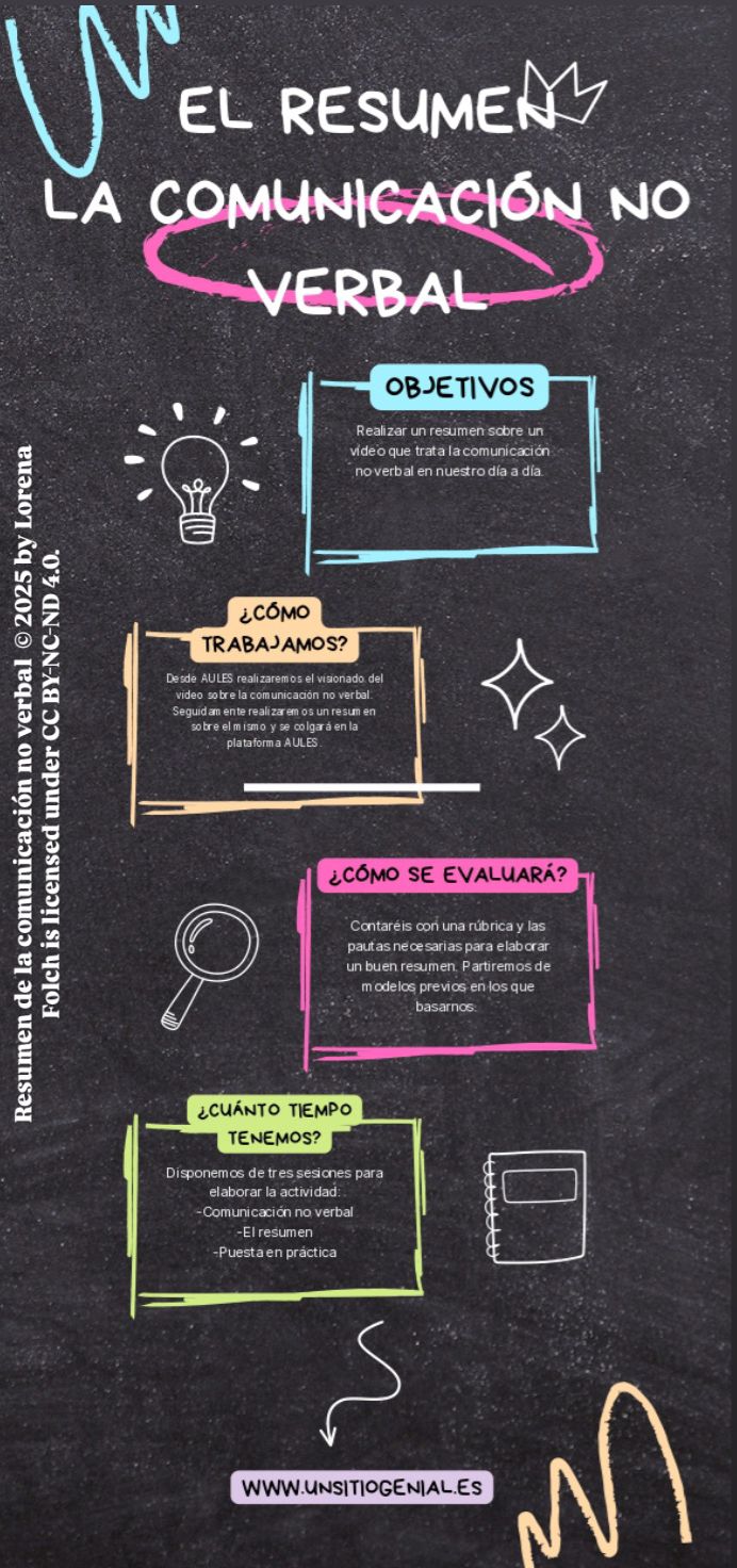 Esta actividad se realiza durante el primer trimestre del curso cuando se estudia la comunicación verbal y la comunicación no verbal. Se trabaja la expresión escrita a través del resumen, para que el alumnado aprenda las particularidades de hacer un buen resumen. Para trabajarlo se realiza el visionado de un vídeo en el que se explica la presencia de la comunicación no verbal en nuestro día a día. Para realizar esta actividad el alumnado dispone de seis días para su entrega. Las fechas comprendidas se ubican desde el 25 de septiembre al 1 de octubre. La realización de esta actividad transcurre durante 3 sesiones. Se explica qué es la comunicación, sus tipos, tanto verbal como no verbal. Se trabajan las características del resumen y se ponen en práctica.