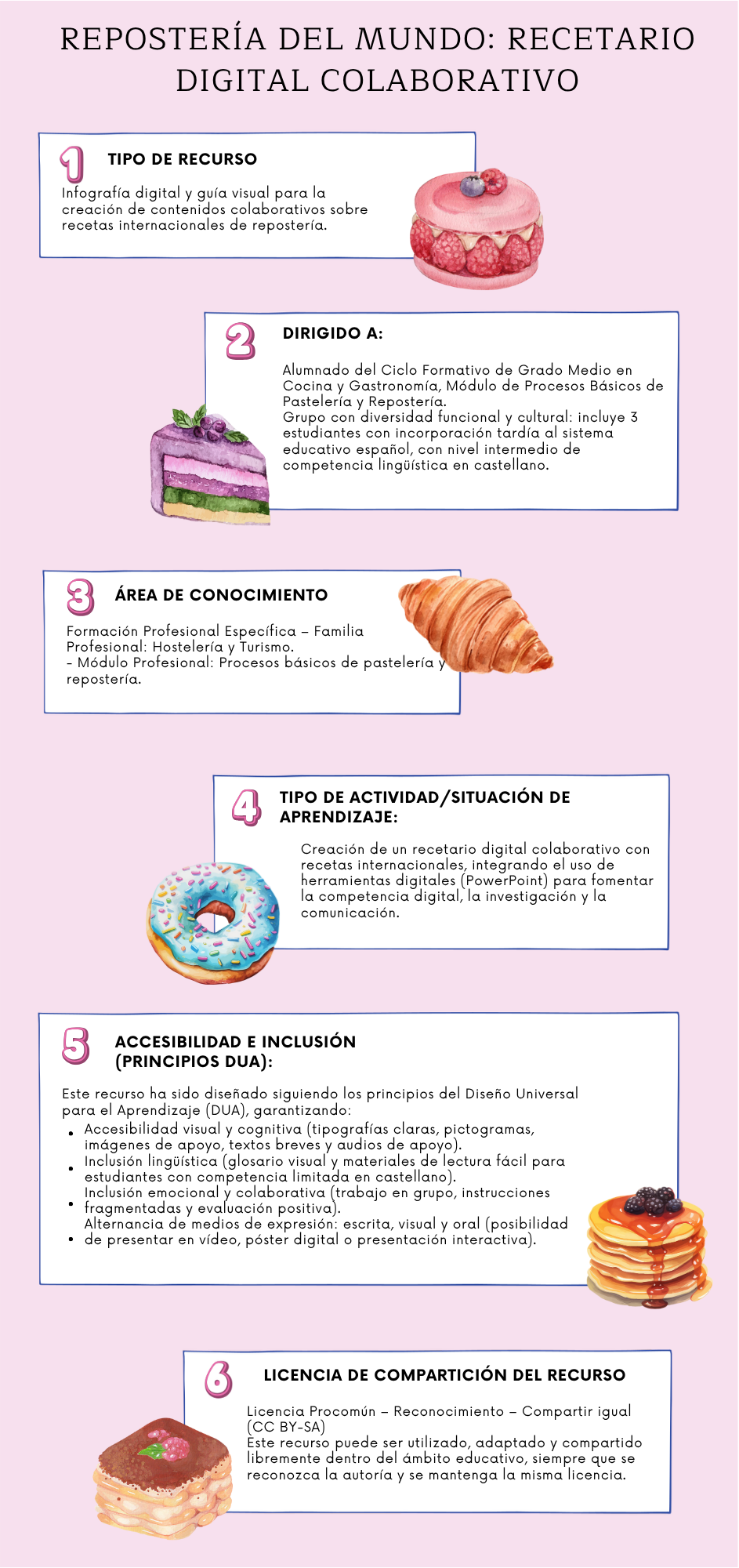 Infografía e instrucciones del recetario digital colaborativo de pastelería.